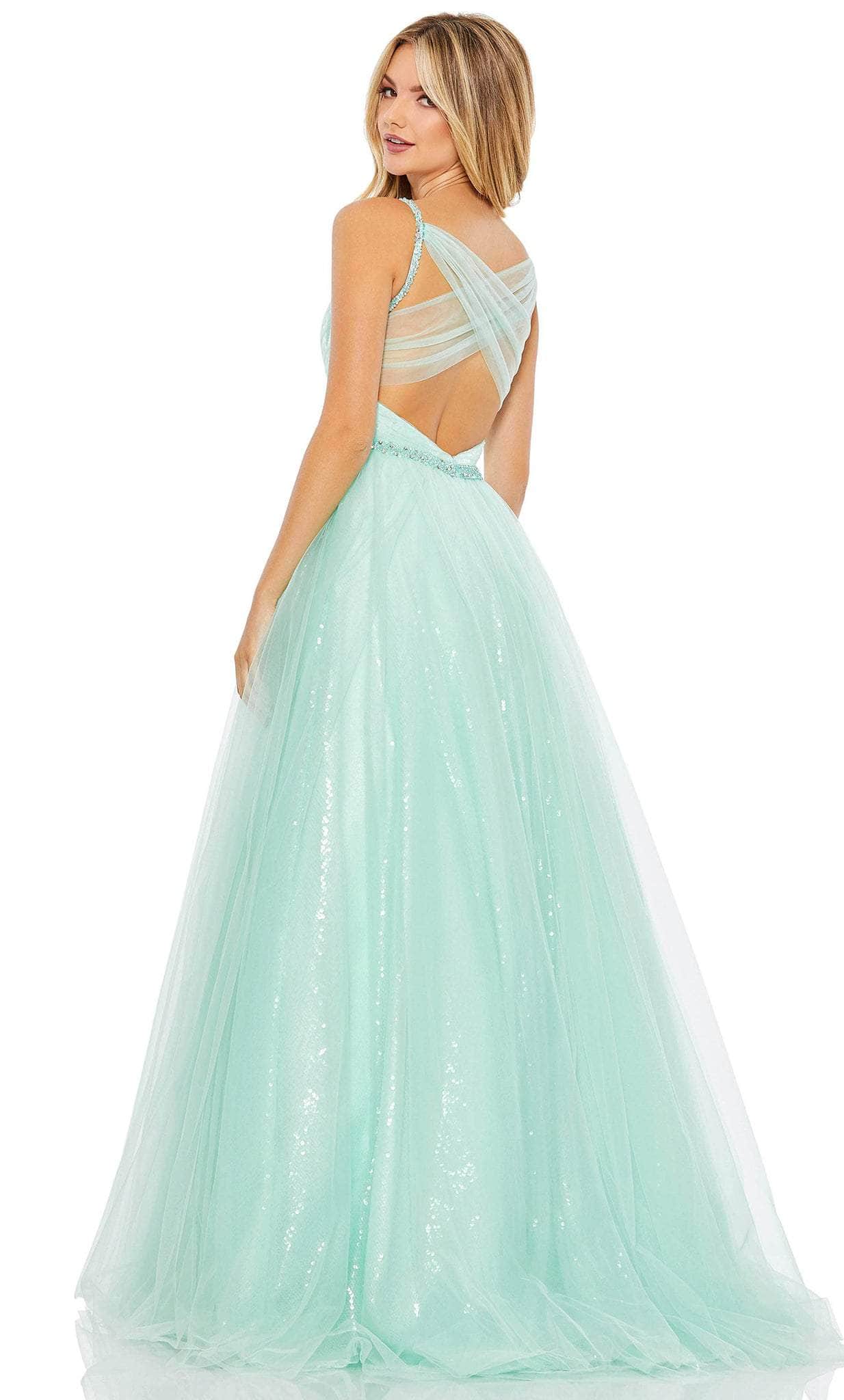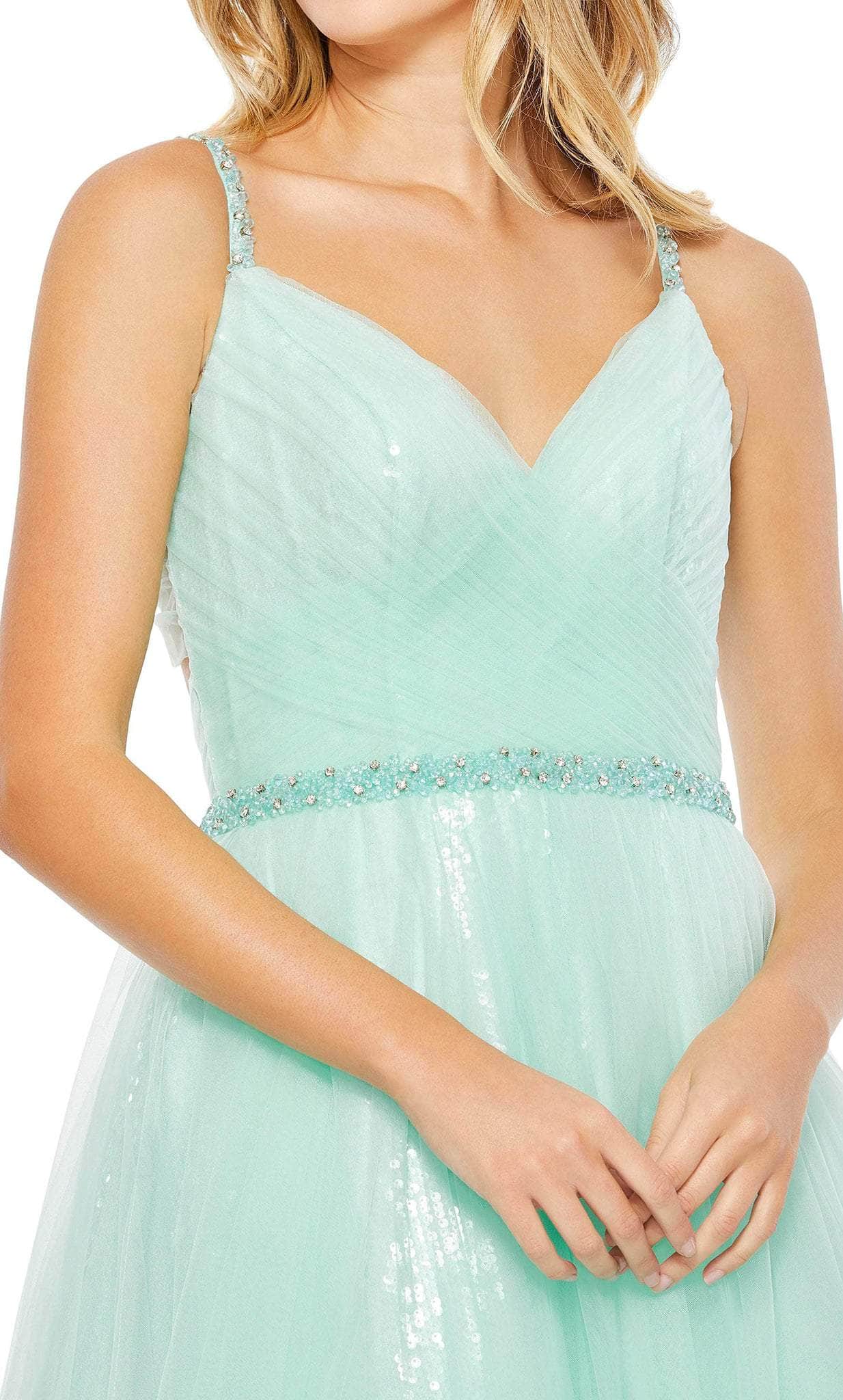 Bring a breathtaking new look to prom night in this stunning Mac Duggal 67565 dress. The clear sequin-covered fabric layered with frothy tulle creates a dazzling effect, capturing the light and creating an enchanting glow. The faux wrap bodice presents a surplice neckline, adorned with embellished spaghetti straps. The beaded waist and crisscross back made from sheer tulle are exquisite details that enhance the allure of the dress. The floor-length skirt cascades into an A-line silhouette that exudes grace and sophistication, creating a look that is both regal and charming. This Mac Duggal 67565 design will make you feel like a princess for an evening, with its luxurious charm and refined details. Model is wearing Mint color.