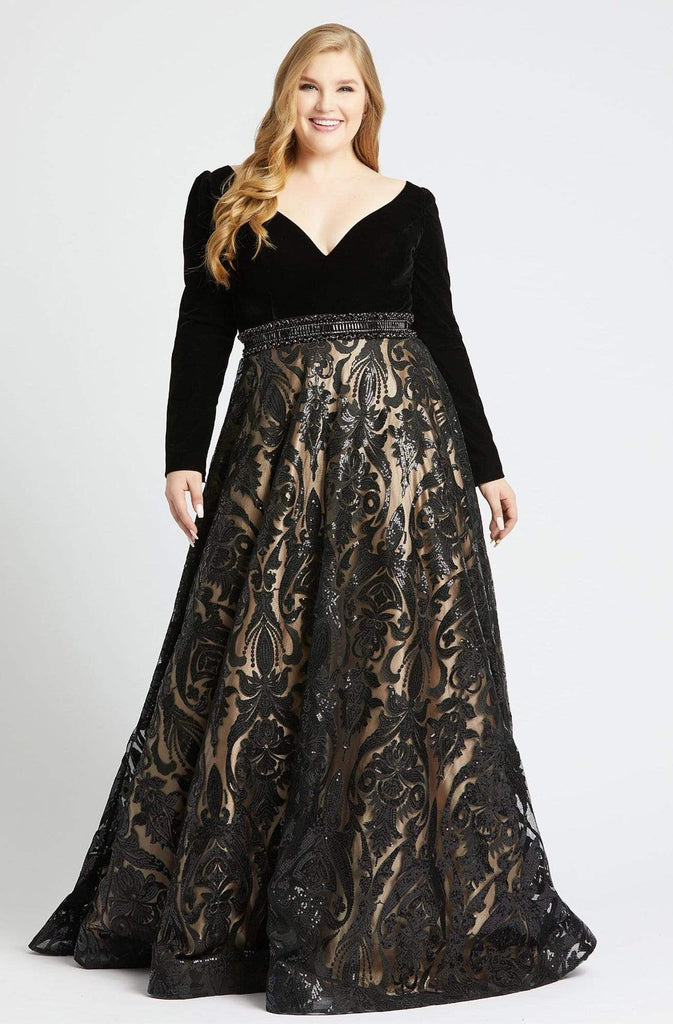 Portray the rich variety in design of this gown by Mac Duggal Fabulouss 67614. Shows off with a plunging V-neckline with long sleeves. The velvet bodice is wrapped in a beaded belt and forms a sequined ballgown skirt with sweep train finish. Be the spotlight wearing this extravagant Mac Duggal gown.