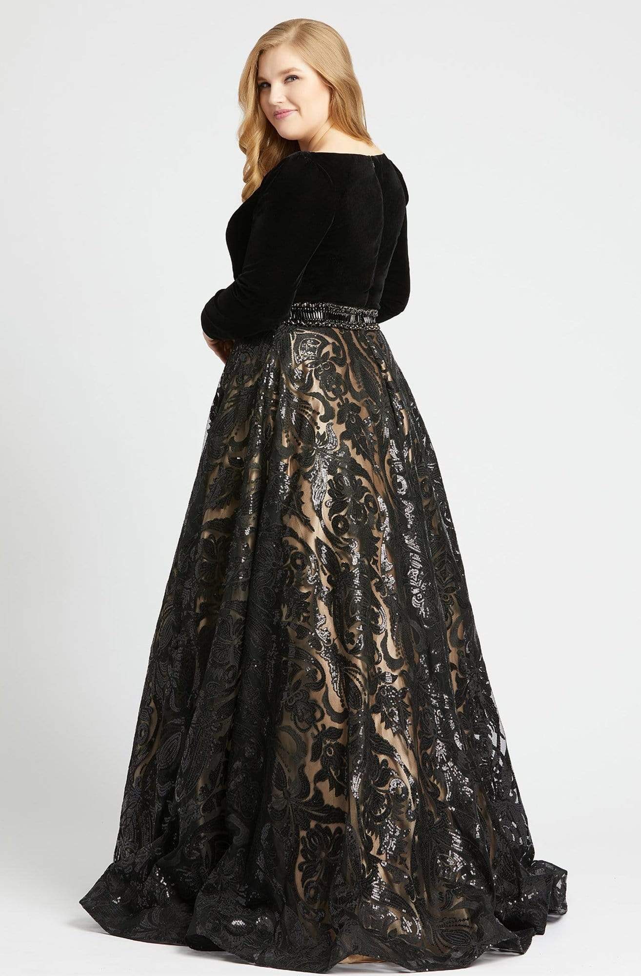| Details: | Velvet bodice, Plunging neckline, Long sleeves, Beaded waist, Ballgown skirt, Sequins, Back zipper, Sweep train |
