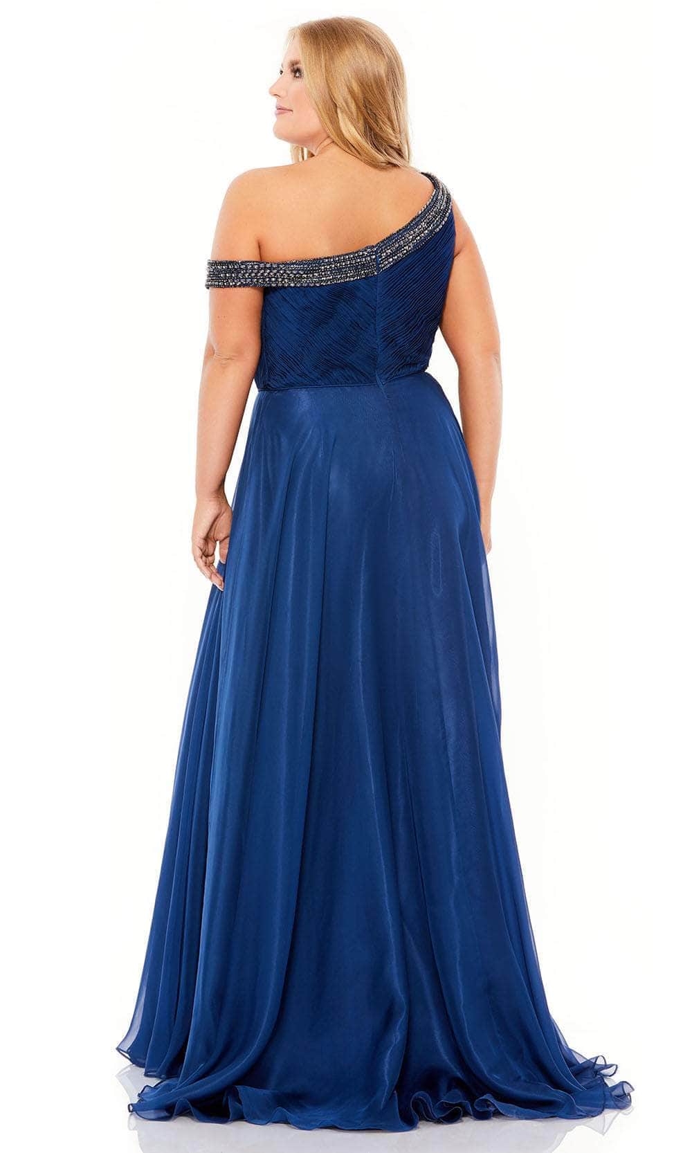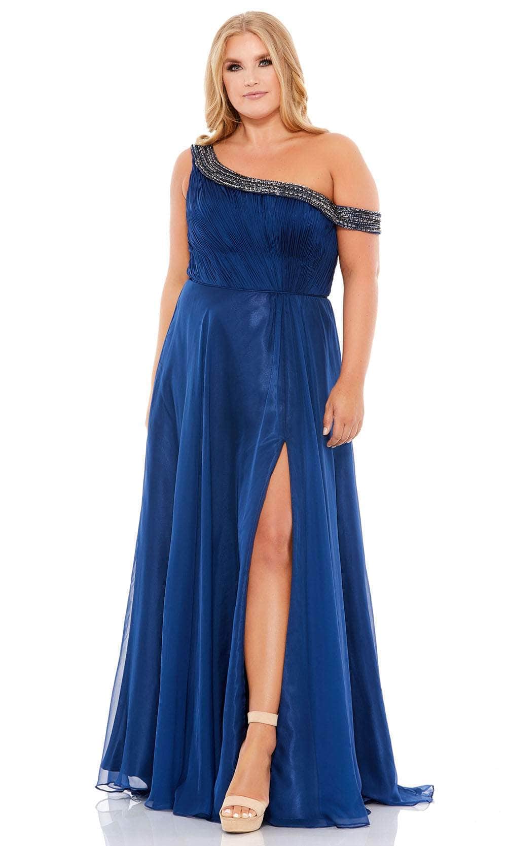 Be a woman of style and beauty in this classy Mac Duggal 67727 gown. Crafted from comfortable organza fabric, this piece has rhinestones beaded trim on the asymmetrical neckline and midrise back. Pleated detail along the bodice adds allure to this gown. The A-line skirt gracefully streams to the floor-sweeping train, finished with side high slit to show off your sexy legs. The night is yours in a spectacular creation from Mac Duggal 67727. Models are wearing the Midnight, and Red colors.