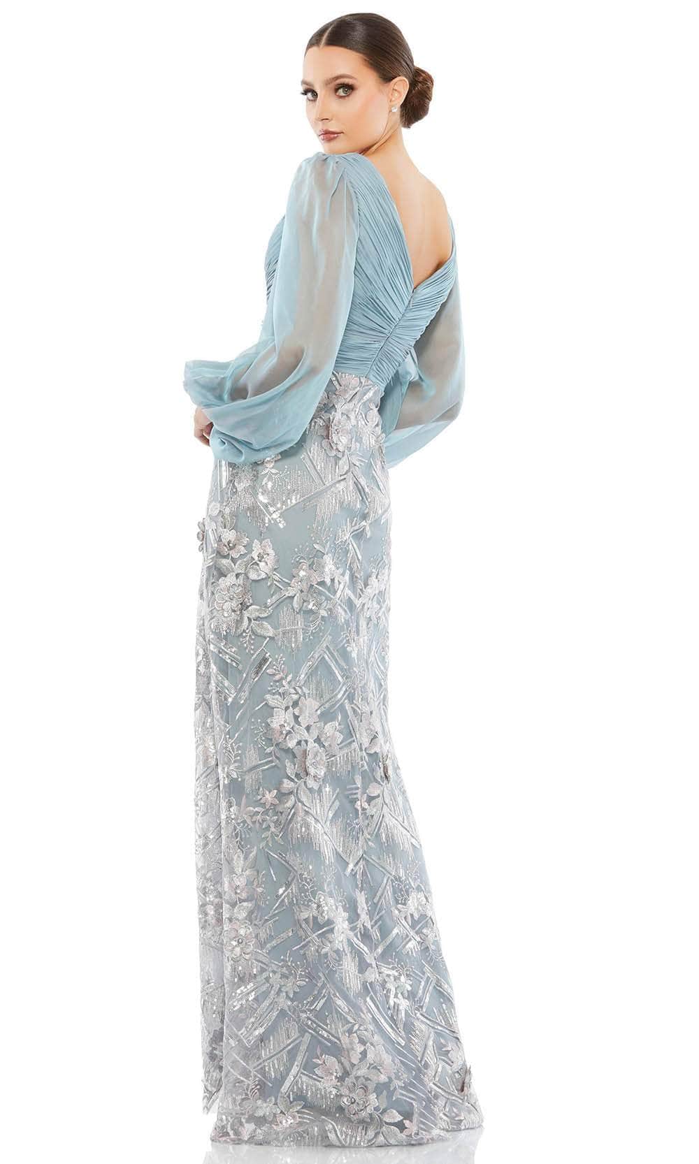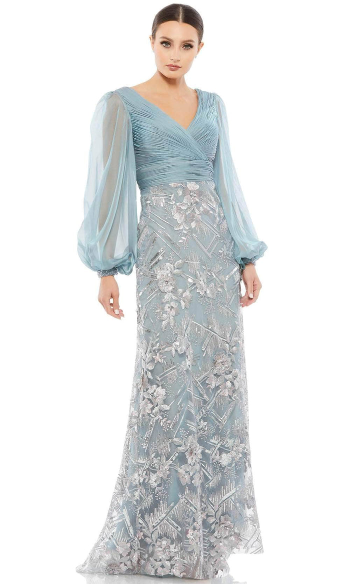 Have them hooked on your sophisticated and classy style when you enthrall with this Mac Duggal 67886 creation. Ornate with floral embroideries and sequined accents, this sheer long puffed sleeve dress features a V-neckline with a pleated fitted bodice and a V-back with zipper closure. Crown with a wide waistband, the sheath skirt streams down beautifully to a floor length hem. Capture a sophistication that stuns in this Mac Duggal masterpiece. Model is wearing the Slate Blue color.