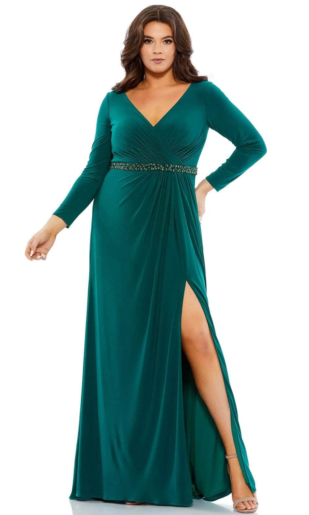 Wear this simple but captivating Mac Duggal 67899 to your next parties and events to look your best. This eye-catching jersey dress flaunts a long sleeve bodice crowned with a v-neckline and ruching details. The waistline is embellished with glamorous rhinestones. Reveals a full back that is secured with a zipper closure along with a skirt in an A-line silhouette. This enchanting Mac Duggal 67899 design is sure to make you the center of everyone's attention. Models are wearing Midnight and Emerald colors.