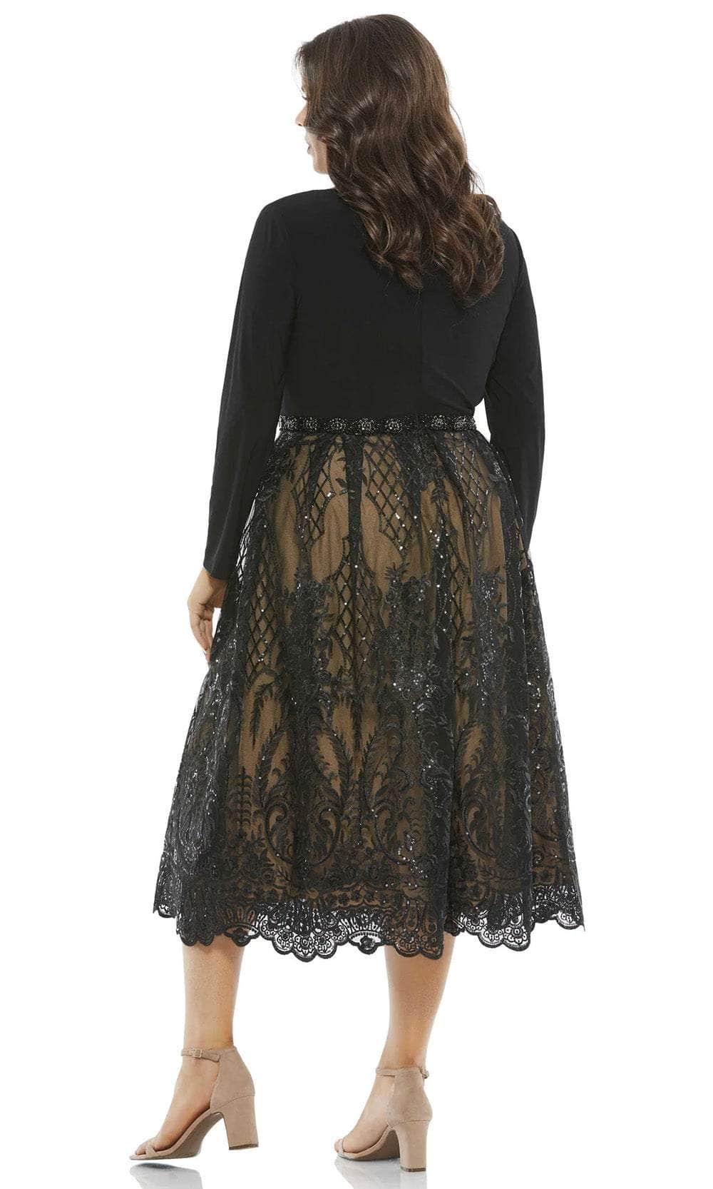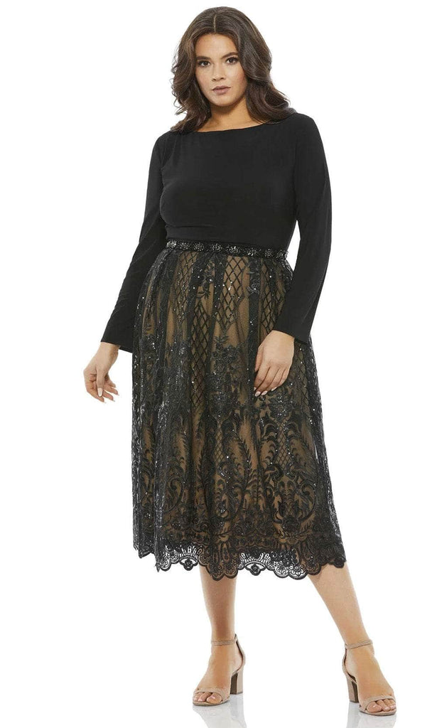 Exude sophistication in Mac Duggal 67905, a knee-length dress that effortlessly blends timeless elegance with modern charm. The bateau neckline and long sleeves add a touch of refinement to the fitted bodice. The full-back with a center zipper closure ensures a seamless look. The embroidered A-line silhouette skirt enhances the overall allure, creating a harmonious balance between classic and contemporary elements. Perfect for various occasions, this Mac Duggal 67905 is a testament to understated glamour and tasteful style. Model is wearing Black Nude color.