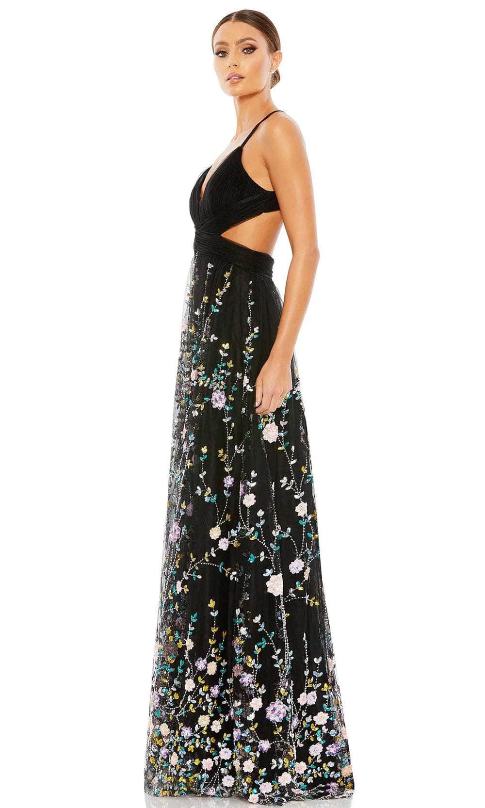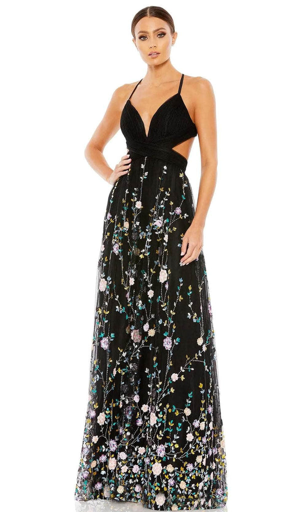 Express your unique persona classic sophistication as you wear this dress from Mac Duggal 67976. A plunging V-neckline with spaghetti straps frames this sleeveless beauty's exquisite pleats and floral accents. It has an open back with a distinctive strap pattern that is closed with a zipper. When the skirt is flowing down to a floor-length hem, the pleated waistband sits atop the waist. This Mac Duggal 67976 creation is truly a definition of glamour. Model is wearing Black/Multi color. Find more Mac Duggal Dresses.