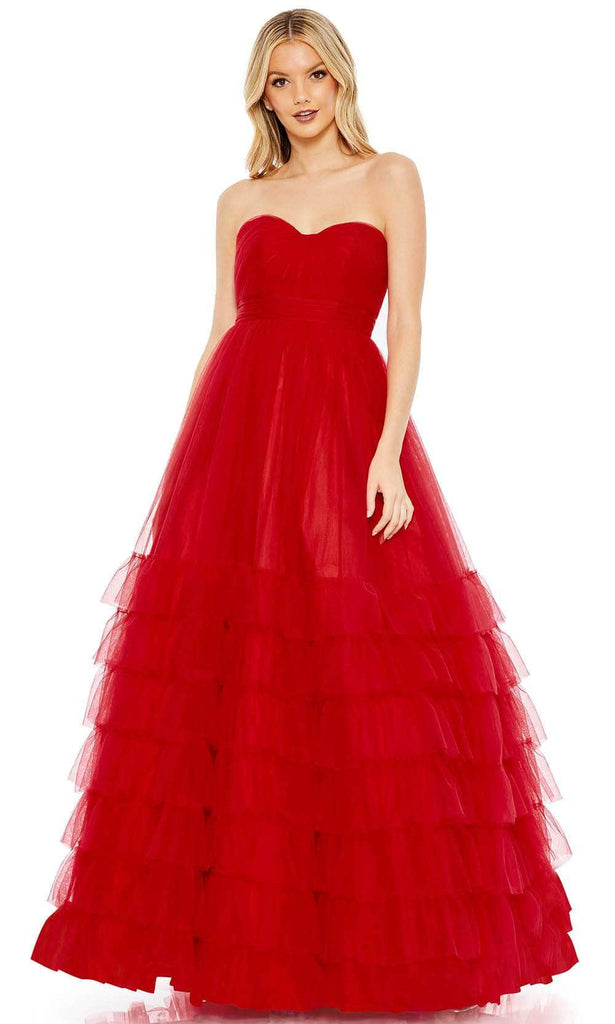 Look remarkably stunning in this elegant gown from Mac Duggal 67999. A subtle yet alluring look boasts this gorgeous strapless piece. Exquisite pleats were encapsulated on the fitted bodice as well as to the waistband. A mid-open back with zipper closure creates a tempting look while the sheer layered skirt flows down to a full-length hem with ruffle details. Fancily grace every party with elegance and beauty in this stunning Mac Duggal masterpiece. Models are wearing Red and White colors.