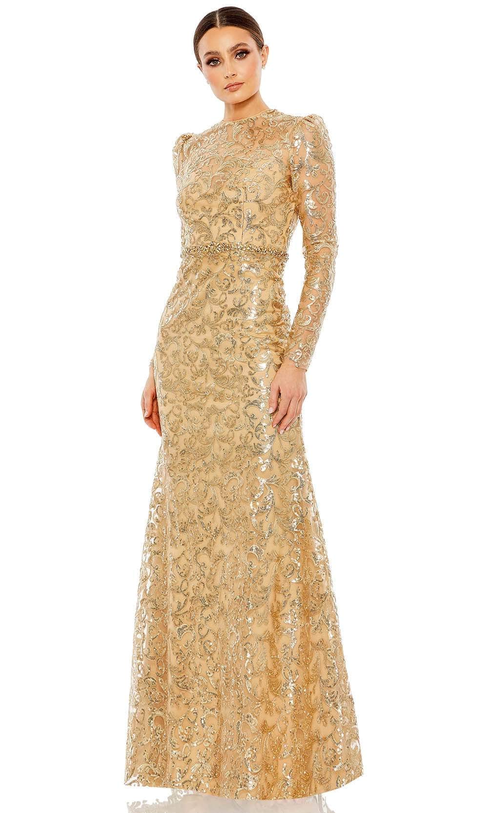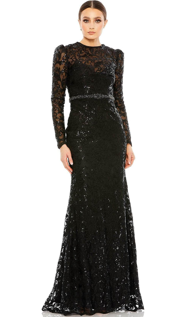Wearing this Mac Duggal 68011 masterpiece, you will shine all night. This piece has a figure-flattering bodice richly decorated with embroidery and shimmering sequins. It also consists of an illusion bodice topped by a high neckline, long sleeves and full back with a zipped-up closure. The waist is emphasized by a beaded thin belt, while the skirt drapes elegantly to the full length hem in a sheath silhouette and ends in a sweep train. Look lovely in this timeless Mac Duggal 68011 creation. Models are wearing Black, and Gold colors.