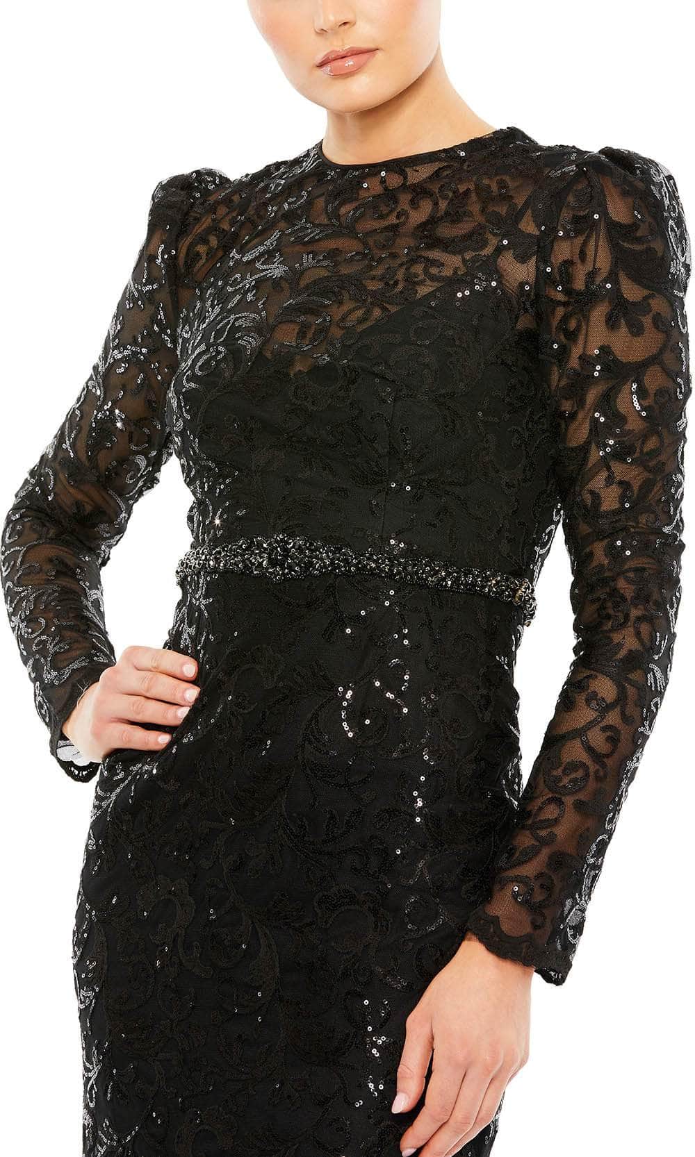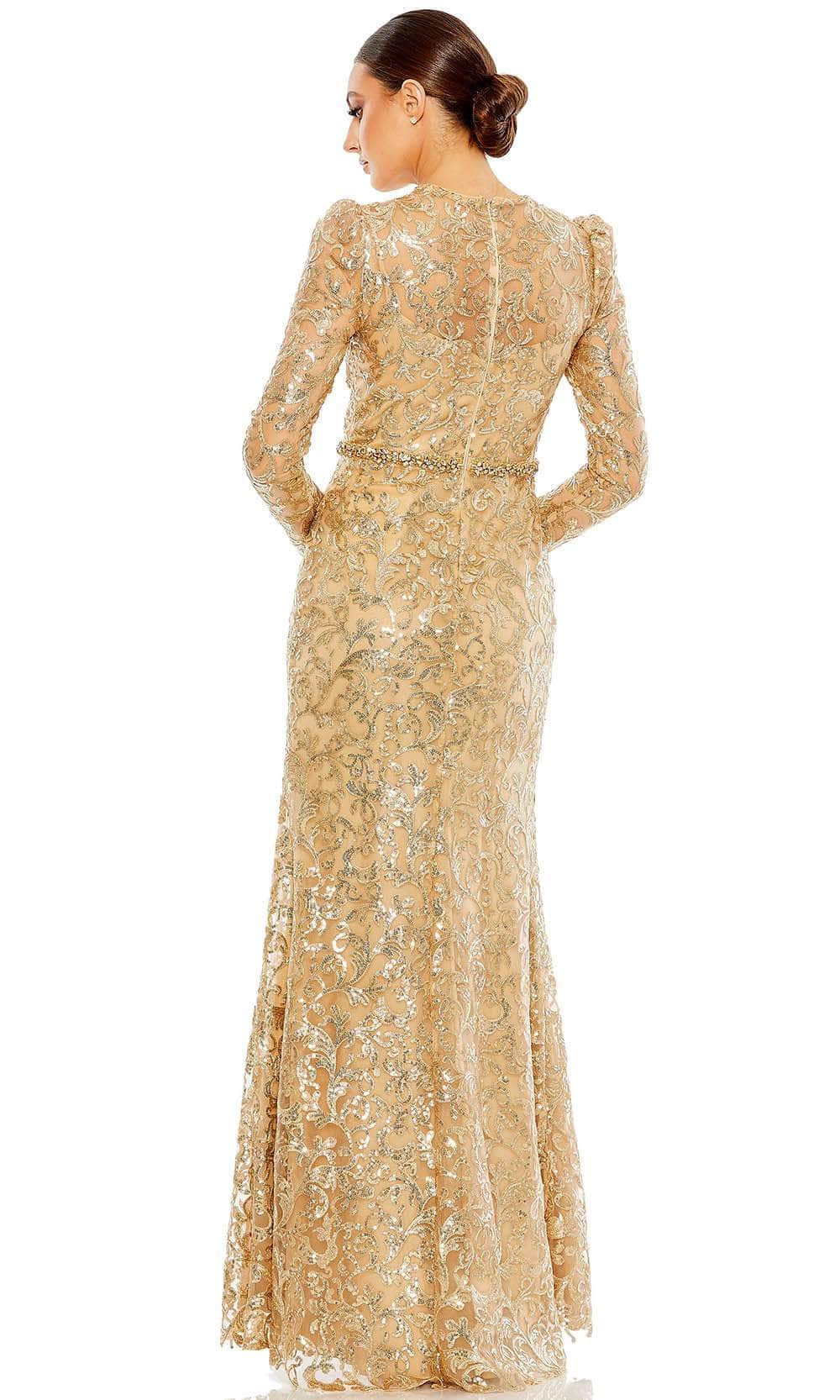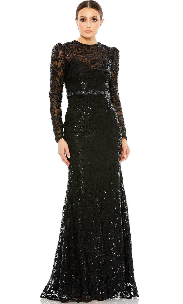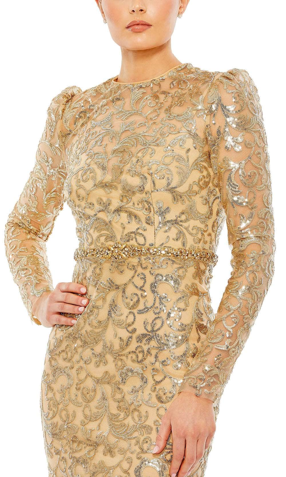 Turn yourself into a head-turning sensation by slipping into this utterly fetching Mac Duggal 68011 prom dress. Festooned with embroidery and sequins defining the figure-flattering silhouette. The dress showcases an illusion bodice with a high neckline, long sleeves and a full back with center zipper closure. Accented with a beaded belt, the sheath skirt gracefully flow to the full length hem and exit in a sweep train. This Mac Duggal 68011 creation is specially designed to make that special occasion worth reminiscing. Models are wearing the Black and Gold colors.