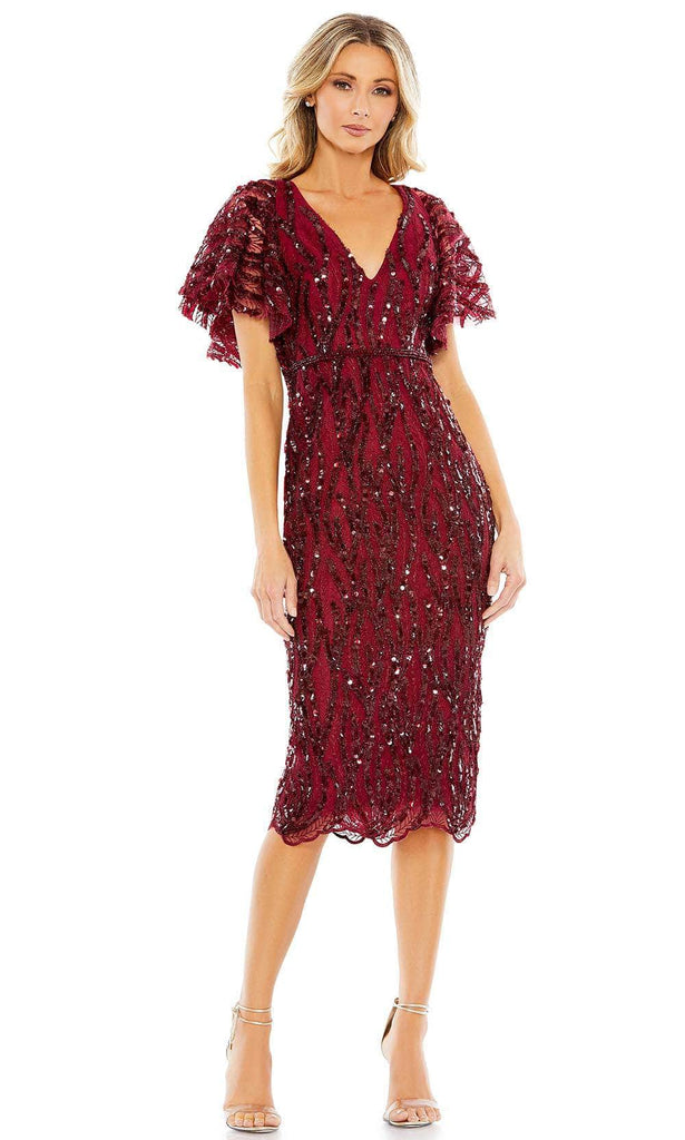 Glamour up for a night of exquisite elegance in this Mac Duggal 68013 cocktail dress. From the modest v-neckline to the bottom, the dress is beautifully ornamented with a combination of beaded, sequins and embroidery. It has stunning short butterfly sleeves, a full back and a beaded thin belt. Flowing softly from the waist, the sheath skirt hits the tea length and finishes in a scalloped hem. Leave a trail of admirers as you glisten in beauty in this Mac Duggal 68013 masterpiece. Model is wearing the Burgundy color.
