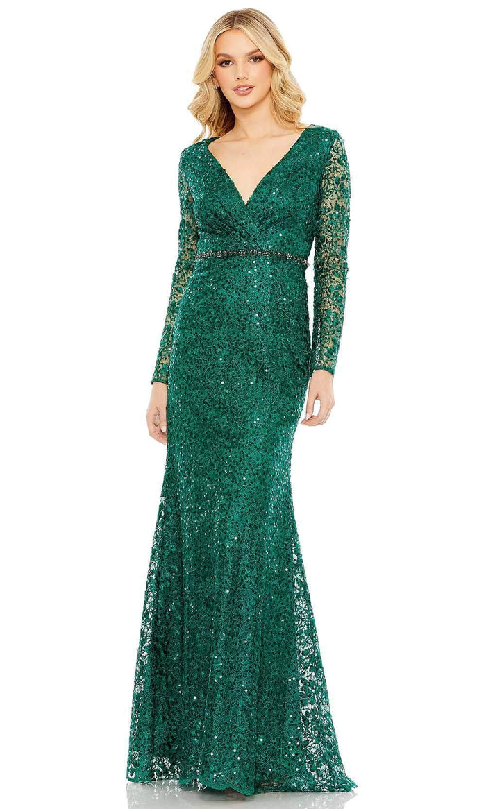 Crown yourself with a radiant aura in this exquisitely made Mac Duggal 68016 creation. Astoundingly detailed with exquisite embroidered details mingling with shimmering sequins, this ensemble features a tailored lining with a lace overlay. Crafted with sheer long sleeves and accented with a deep v-neckline, this stunner also parades a full back with a zipper closure. Shimmering adornments graces the faux wrap bodice as the waist features beaded embellishments. this beauty features a skirt that streams to the floor with a sheath design and a brush of train. Be the epitome of poise and sophistication when you arrive in this Mac Duggal 68016 masterpiece. Models are wearing the Black and Emerald colors.