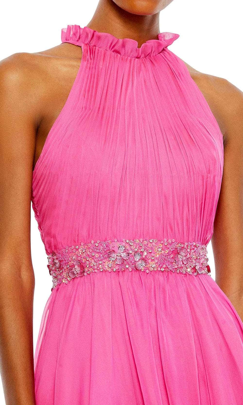 Get noticed in any crowd wearing this stunning creation by Mac Duggal 68029 dress. Pleated bodice with sleeveless frame and a halter neckline, complemented with a full back that has a concealed center zipper closure. Rhinestone embellishments are perfectly adorned in the waistband. Striking ruffles detail the A-line skirt and finish with a high low hemline and sweep train. Bloom with beauty and love as you saunter towards forever in this Mac Duggal 68029 masterpiece. Models are wearing Hot Pink and Ice Blue colors. Find more Pink Dresses.