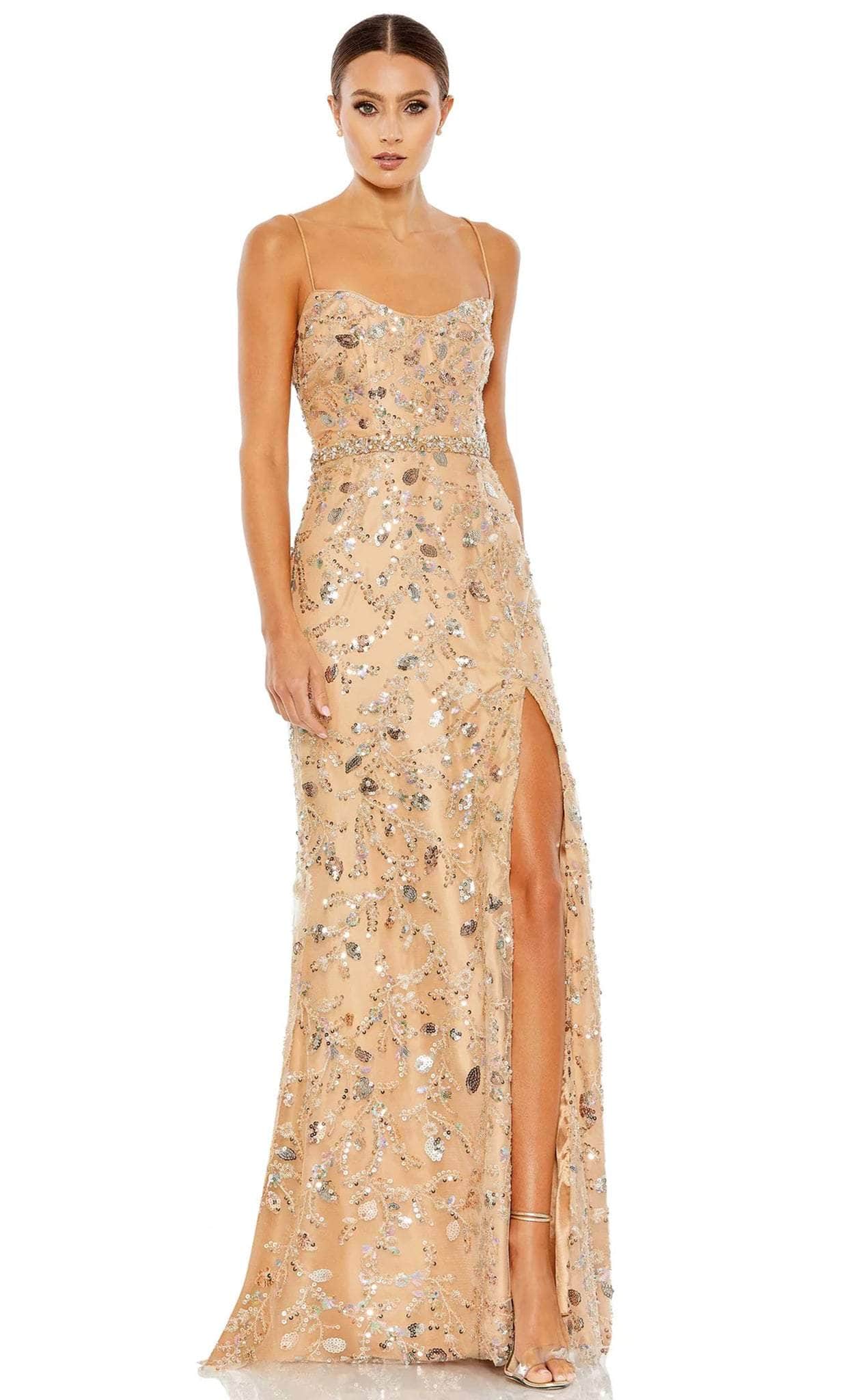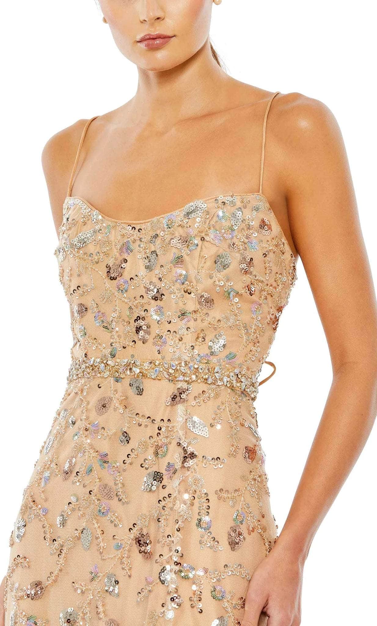 Unveil that inner diva in you when you flourish with this exceptional Mac Duggal 68049 creation. Covered extravagantly in glittering sequins and beadwork, this sleeveless piece showcases a scoop neckline and spaghetti straps that lace up at the open back. A stylish beaded thin band embraces the waist for a slim fit. The skirt creates an A-line silhouette that streams in a full length hem, ending in a thigh-high slit and sweep train. Capture the glamour as you walk on this stunning gorgeous Mac Duggal 68049 gown. Model is wearing the Nude color.