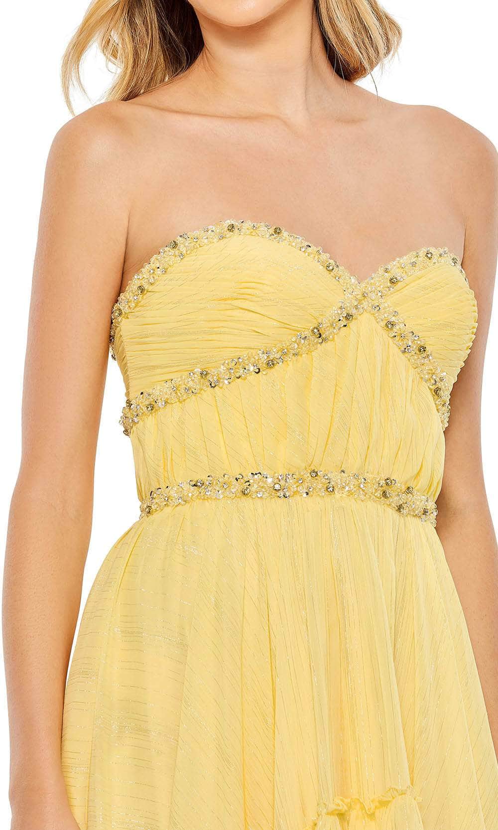 Impress the crowd with your charm as you wear this lovely creation from Mac Duggal 68096. Showcases a ruched bodice with a beadwork floral trim detailing, this beauty has a sweetheart neckline and a mid-open zippered back. The high low skirt reveals an A-line silhouette, designed with a ruffled tiered and has a ravishing sweeping train exits at the back. This Mac Duggal 68096 style is a sure standout on your next evening social event. Models are wearing the Ice Pink and Lemon colors. Find more Pink Dresses.