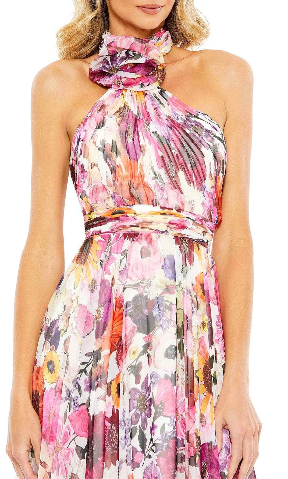 Mac Duggal 68108 gives you a feminine look fit for any special occasion. Crafted in a floral printed fabric, this dress promises a bloom of forever. Staying like a fresh daisy, this dress fashions a high halter neckline with rosette accent on neckline over a ruched bodice. A waist band is put around natural waist to have a sweet transition of flowy A-line skirt in full length with a sweep train. Back is bare and is secured with a zipper. Be in this gorgeous Mac Duggal 68108 creation and leave a lasting impression. Model is wearing White/Multi color.
