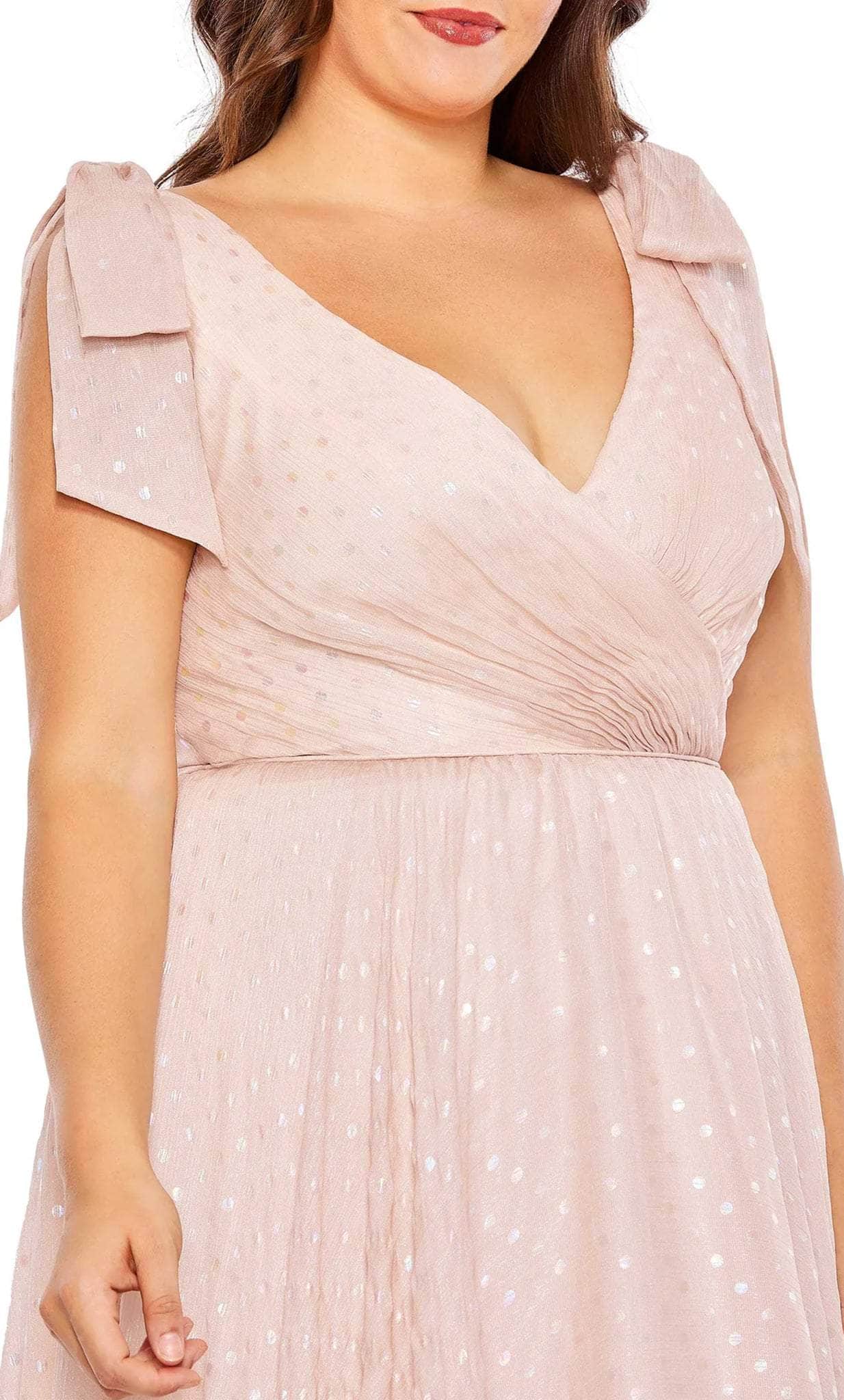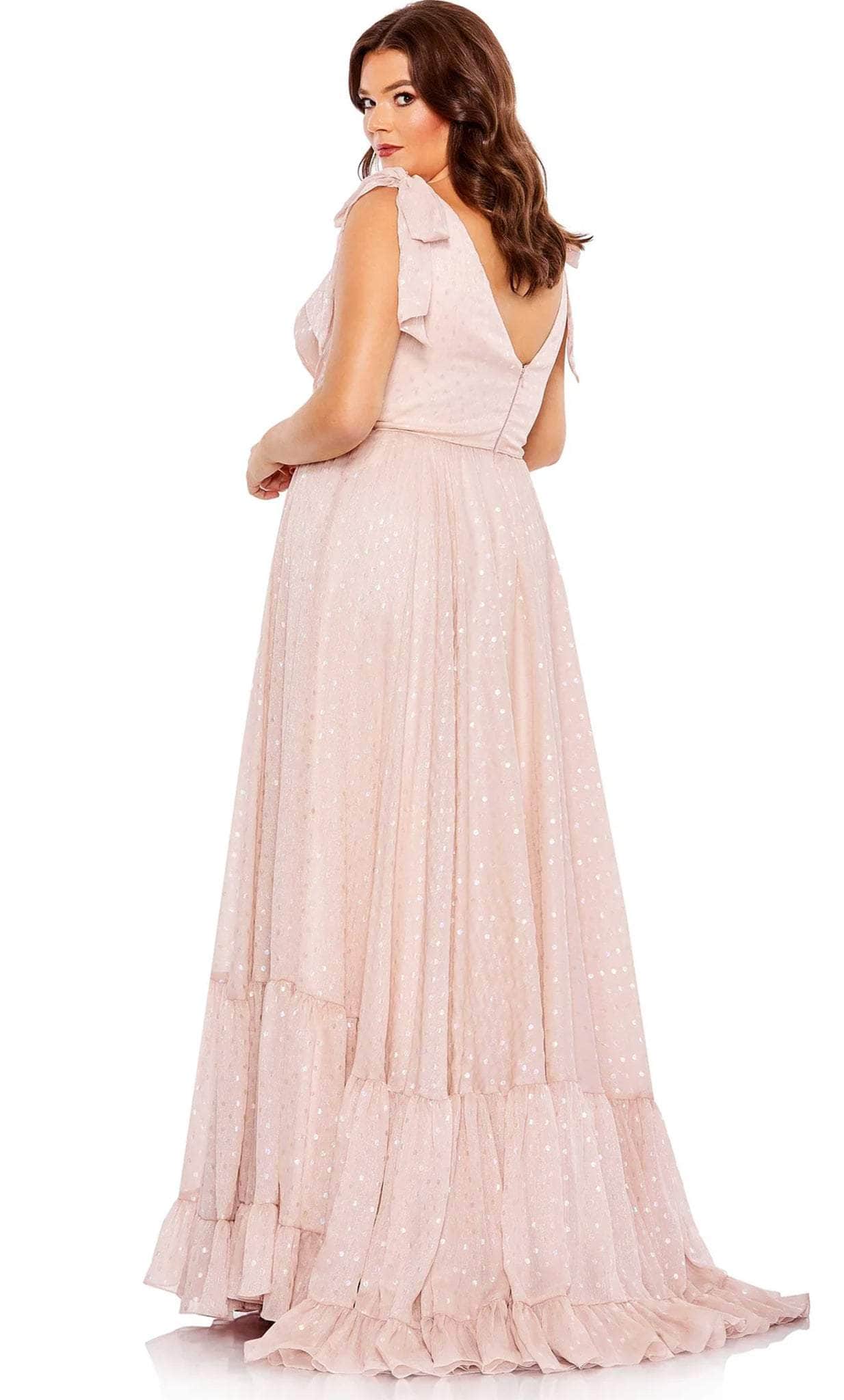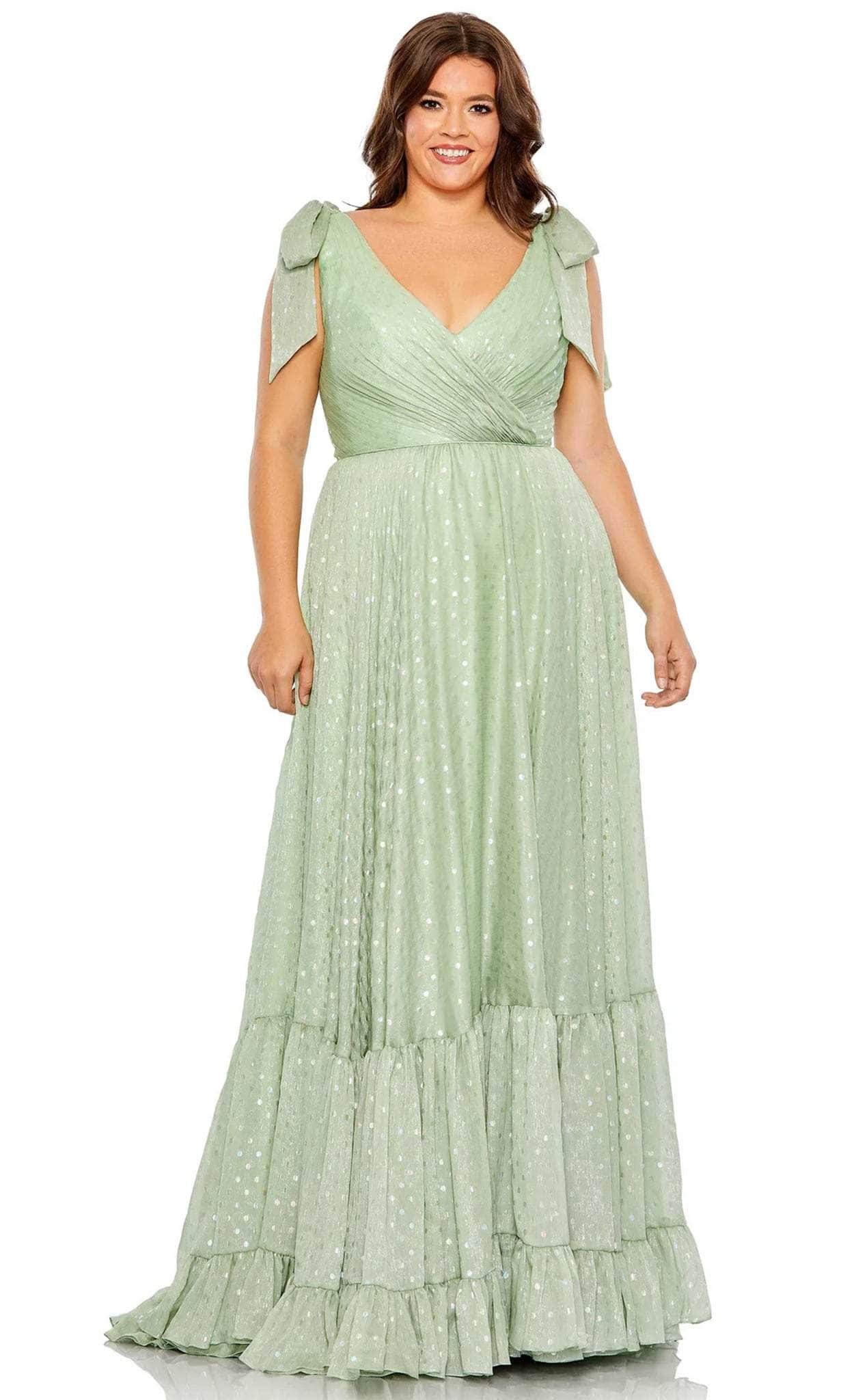 Unleash your inner goddess with Mac Duggal 68120. Tailored from a luxurious metallic polka dot printed chiffon fabric. The fully lined body ensures a comfortable fit, while the V-neckline and faux wrap bodice offer a chic, flattering look. The sleeveless design is perfect for any season. The concealed back zipper ensures a sleek finish, while the train and A-line silhouette offer a graceful movement. The ruffle tiered hemline adds a playful touch to this sophisticated piece. With Mac Duggal 68120, you'll captivate the crowd and leave a lasting impression. Model is wearing the Blush, and Sage colors.