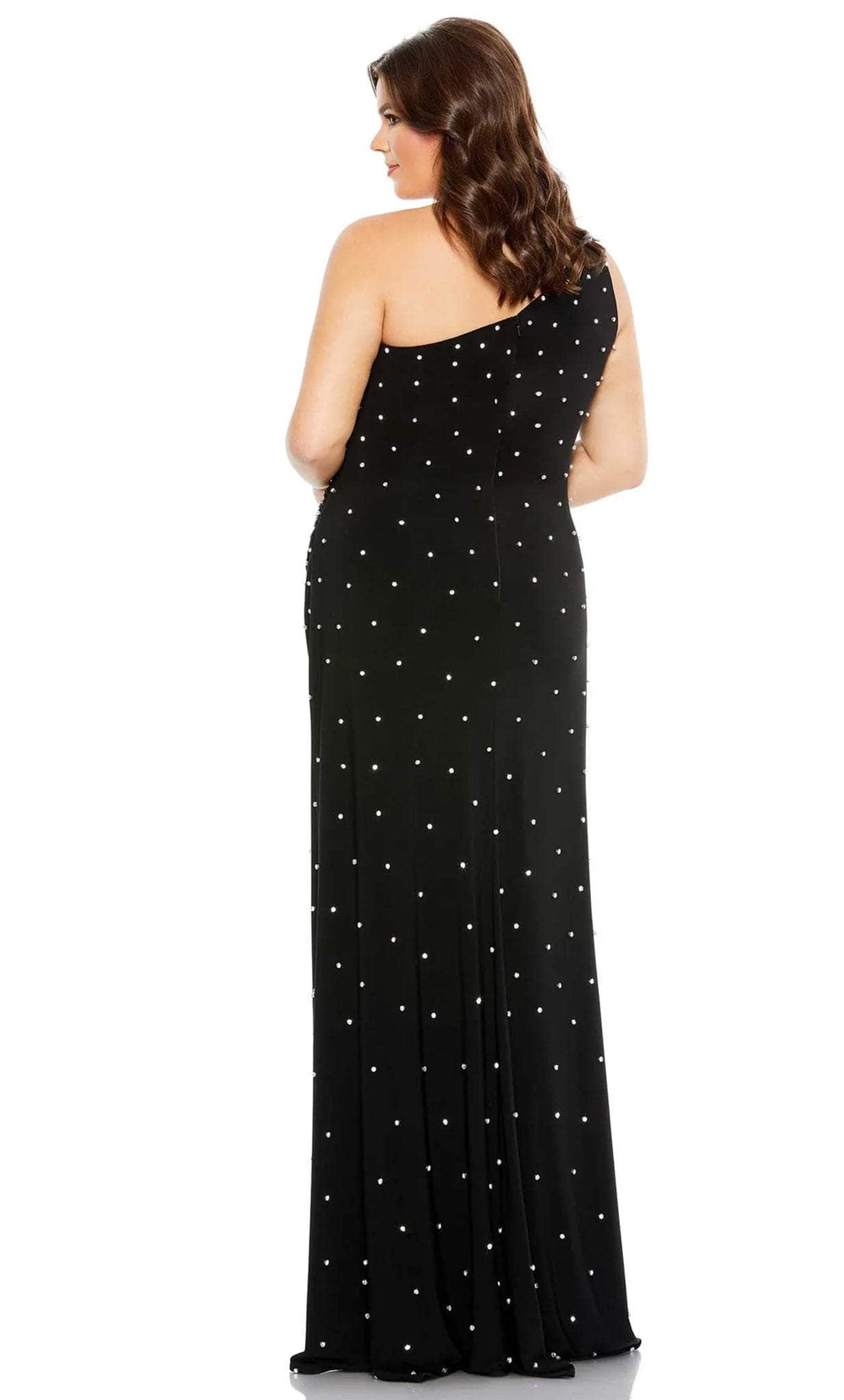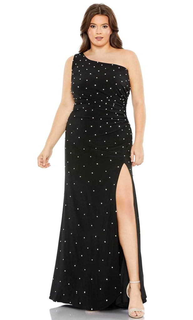 Prepare to dazzle everyone in this sparkling evening gown by Mac Duggal 61830. One-sleeve bodice, natural waistline, and asymmetrical neckline with elegant side ruched details with an elegant center zipper closure at the back for a perfect fit. Sparkling embellishments of rhinestones are adorned all over the ensemble. A full-length skirt with a high slit and a sweep train finish parades in a sheath silhouette. Take your seat on the throne in a queenly gown from Mac Duggal 68340 creation. Models are wearing Black and Cherry colors.