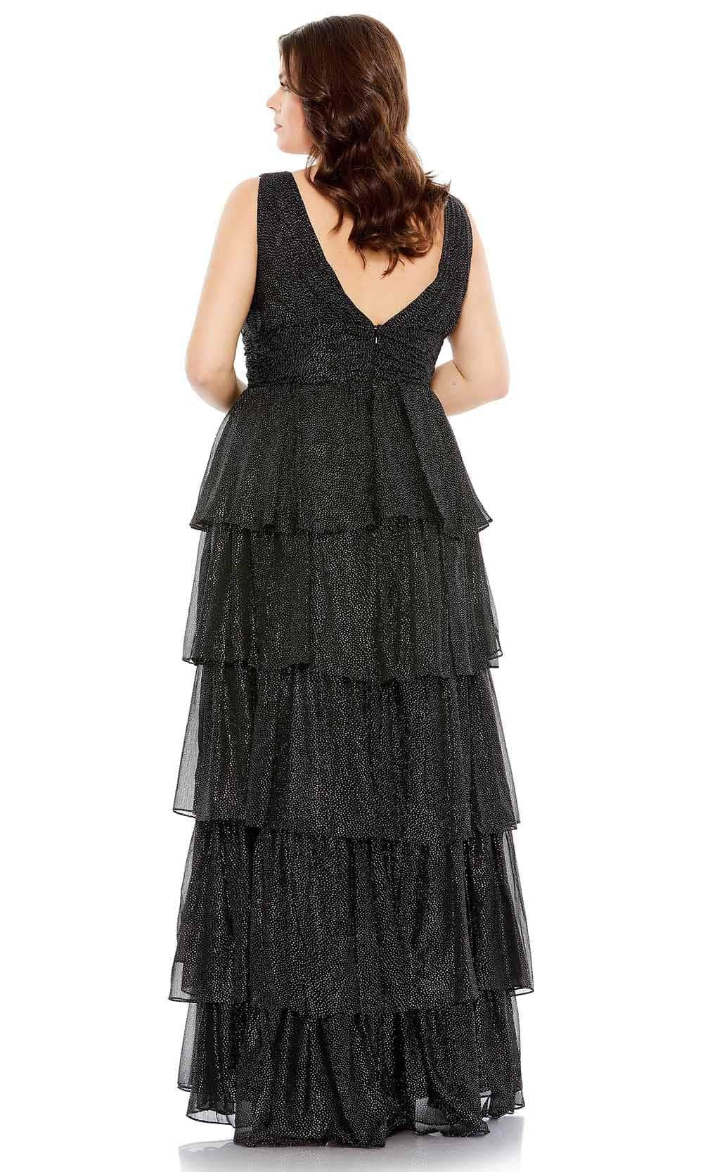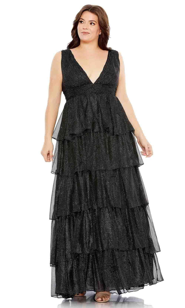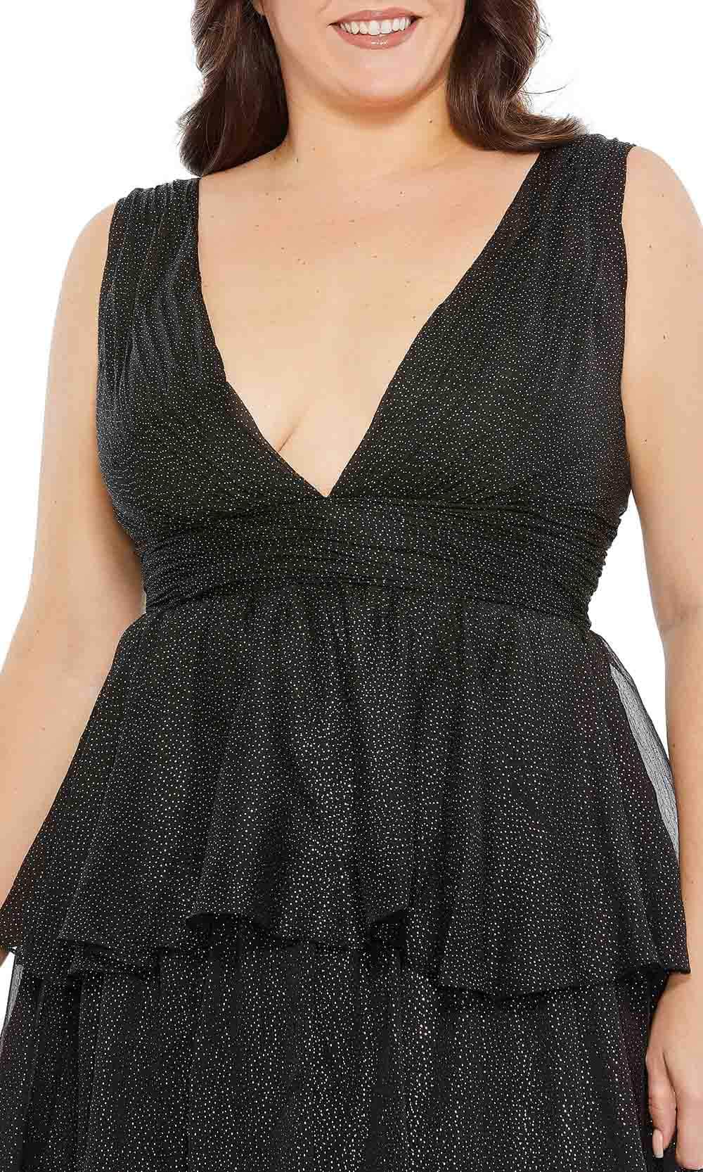 This Mac Duggal tiered dress is the perfect choice for making a statement wherever you go. Crafted with glitter-infused fabric and a v-neck plunge neckline, it will elegantly hug your silhouette. The sleeveless look and ruffled tiered skirt exude a timeless, sophisticated beauty that you won't want to miss. Slip into this Mac Duggal dress and turn heads with your elegant and tasteful style. Model is wearing the Black Silver color.