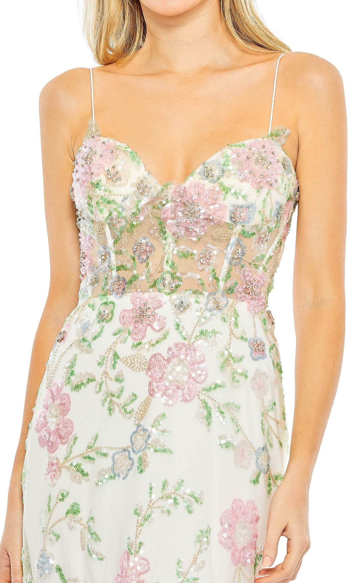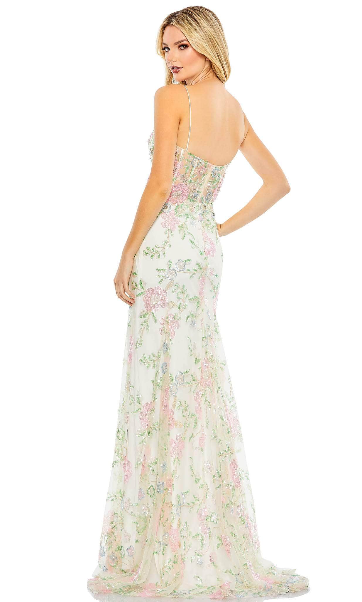 Show off your trendsetting style when you wear this Mac Duggal 68180. Flaunt your figure as you wear this beautiful gown that flatters your shape. It uses a corseted sheer bodice that gives like a fairy tale feel. It is held by thin straps on the shoulders. The gown parades a full length sheath silhouette that ends with a sweep train finish. You will definitely make a statement in every occasion with Mac Duggal 68180. Model is wearing White Multi color.