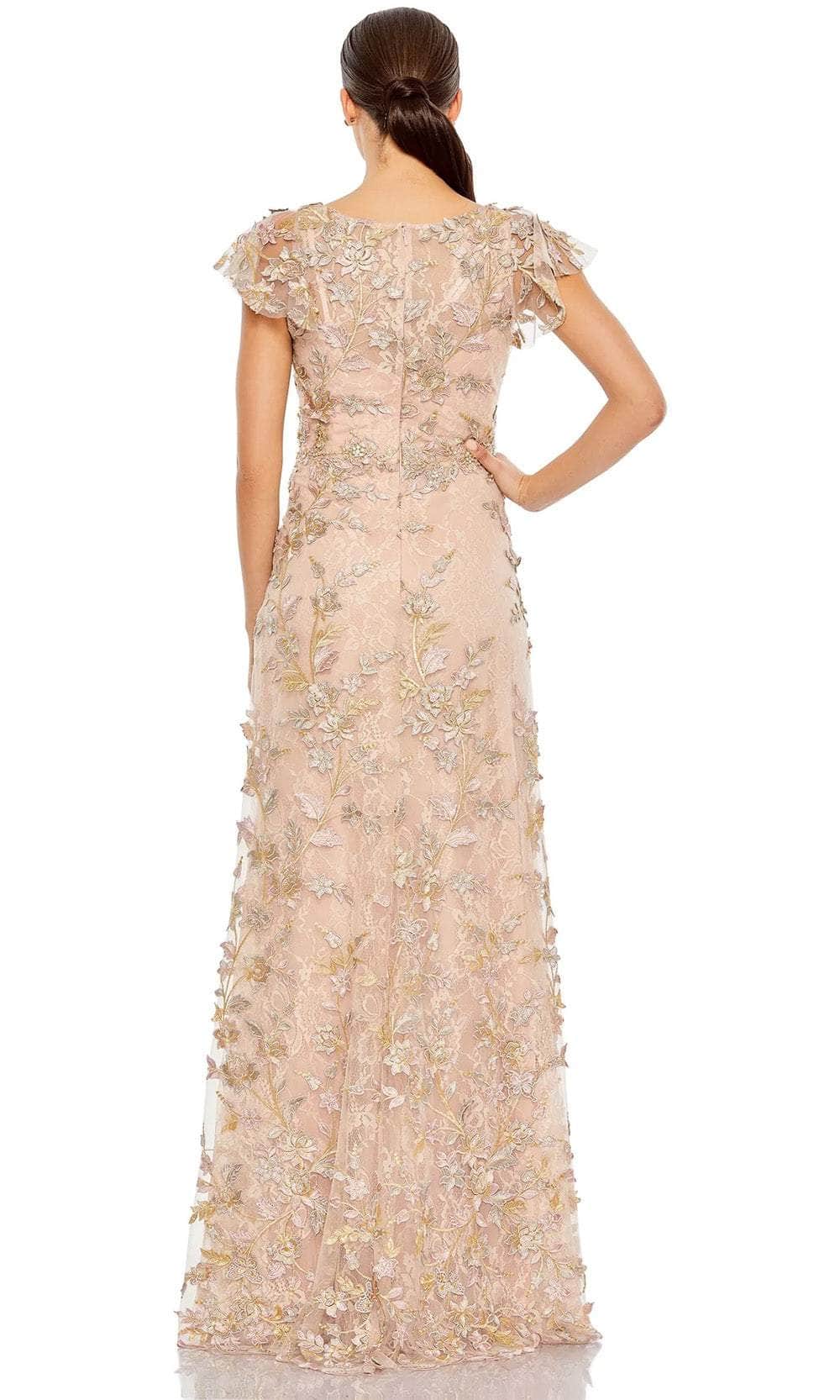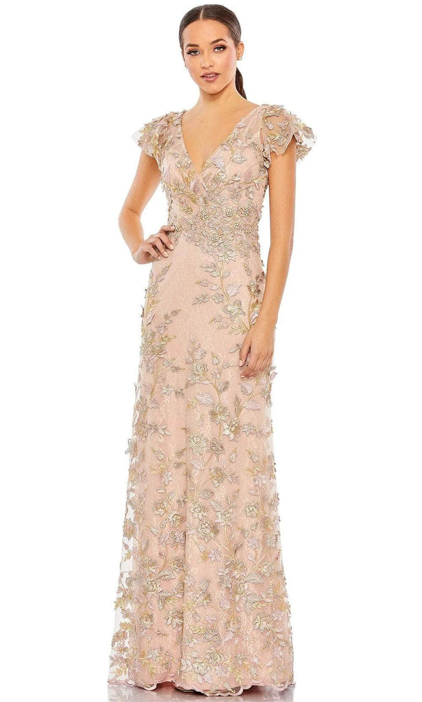 Embrace your inner queen and make a long-lasting impression in this masterpiece from Mac Duggal 68192. Embellished with shimmering beads and a lace applique in a foliage pattern, this gown exudes opulence and femininity. The short flutter sleeves and surplice deep v-neckline add a touch of allure. A concealed zipper closure at the partial illusion back offers a comfortable fit and keeps it all together. The skirt fashions an A-line silhouette that drapes beautifully to the floor length hemline. Mac Duggal 68192 long gown is a charming choice for your next special occasion. Model is wearing Rose Gold color.