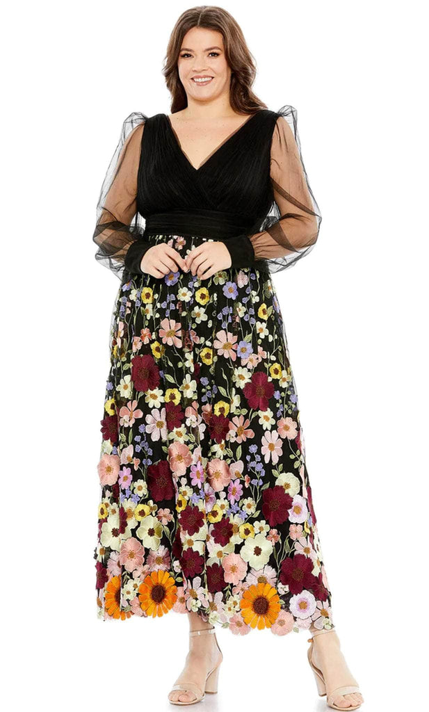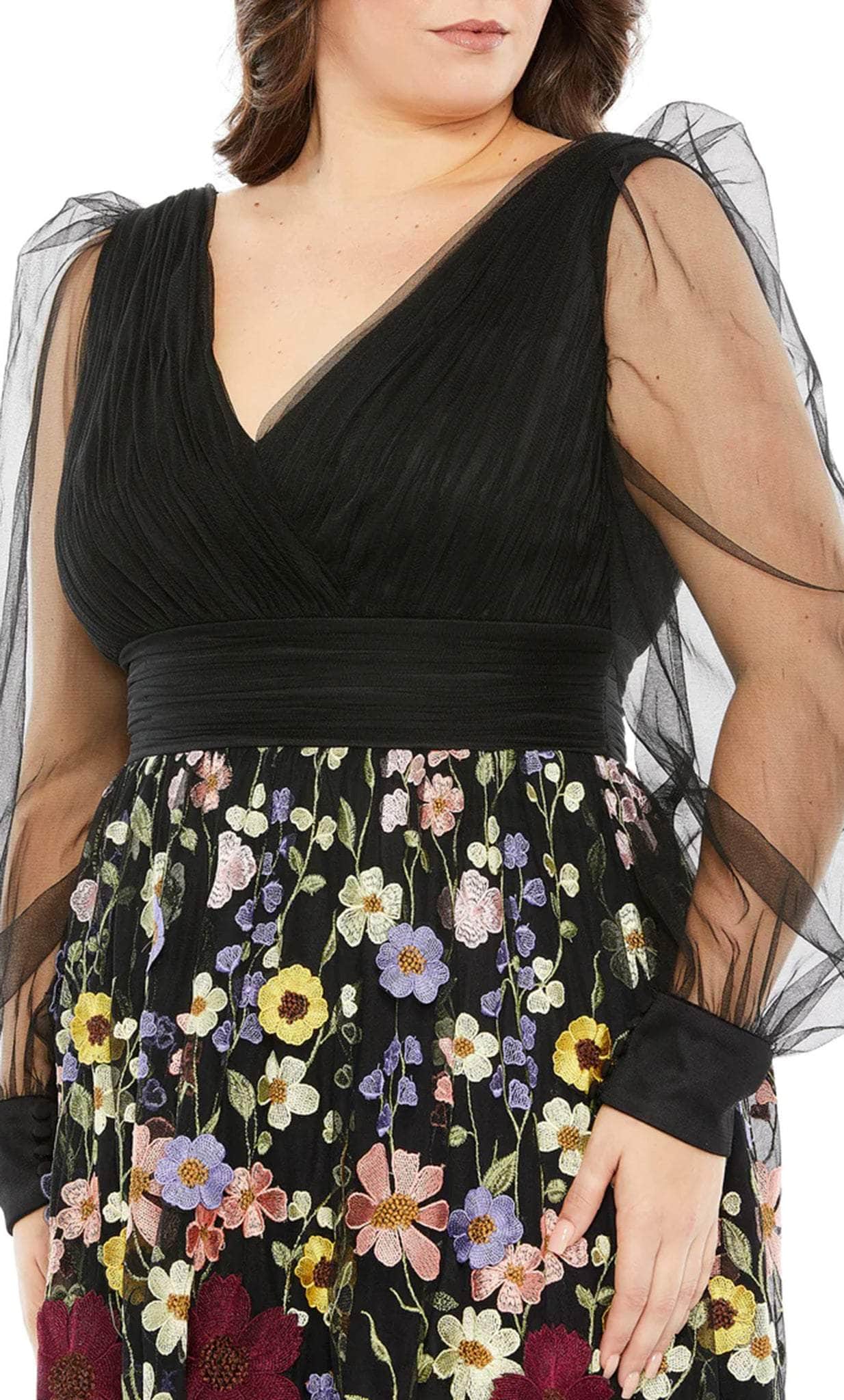 Fill the room with warmth and light in this radiant formal gown by Mac Duggal 68205. Fashionable in a sheer puff sleeve, this long-sleeved dress opens with a deep V-neckline and a pleated chiffon bodice. The skirt demands attention with bold floral appliques, contrasting bright petals with deep hues on an A-line silhouette. Giving a touch of vintage glamour, you will fall in love when you slip on this Mac Duggal 68205 dress. Model is wearing Black Multi color.
