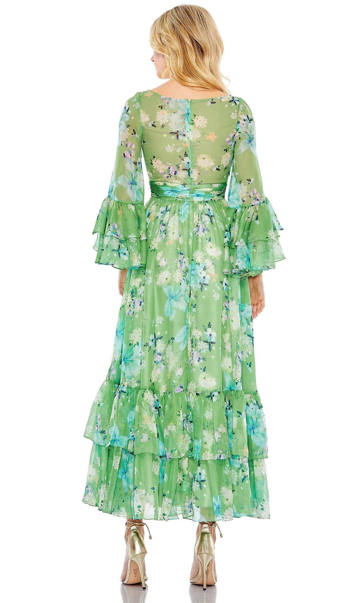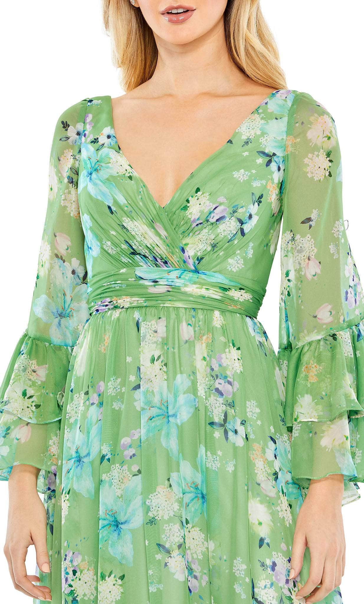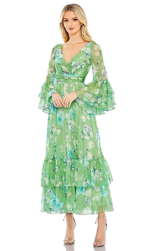 Be the delight of the crowd while making such a mesmerizing entrance in this Mac Duggal 68257 creation. Designed like a breath of fresh air with its verdant spectacle of blossom print on a chiffon silhouette, this dress features a v-neckline atop a ruche detailed faux wrap bodice. Donning sleeves with flounced bell detail, a ruched band accentuates the natural waist. The A-line skirt is festooned with tiers of ruffled panels as it ends with a classy tea length design. Create an outstanding presence at your soiree in this dainty Mac Duggal masterpiece. Model is wearing the Green Multi color.