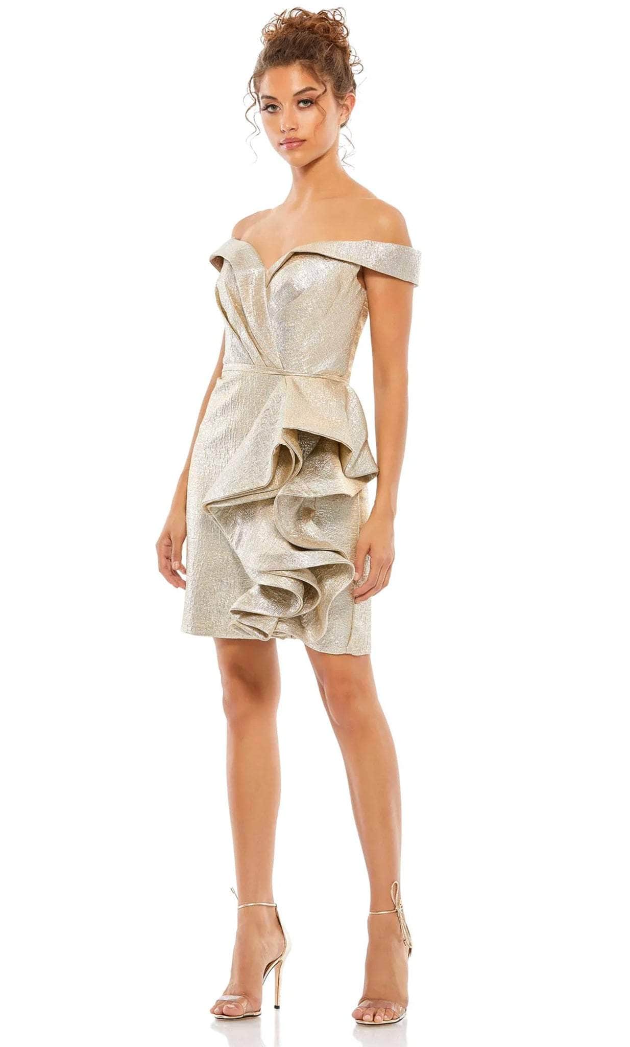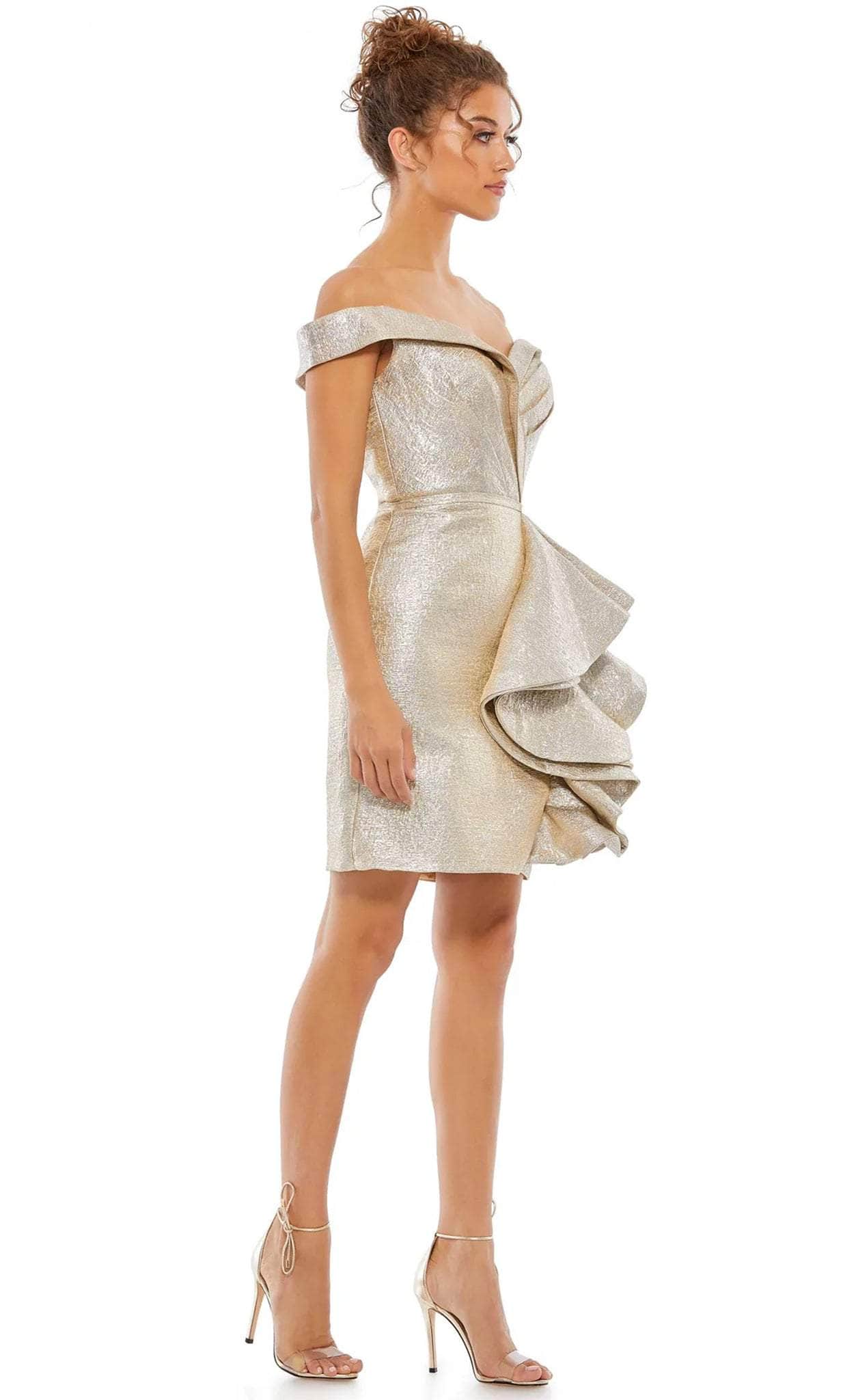 Dare to show off your style in a fashionable dress from Mac Duggal 68325. Crafted with a metallic like fabric, this material gives an instant glow and shimmer. Presents in an off shoulder neckline and a draping ruffled one side. Fits the wearer with the figure-hugging sheath silhouette in short length. This piece is closed with a back zipper closure. Embrace a style that is immaculately sultry as you glam up for your event in this Mac Duggal 68325 creation. Model is wearing Oyster color.