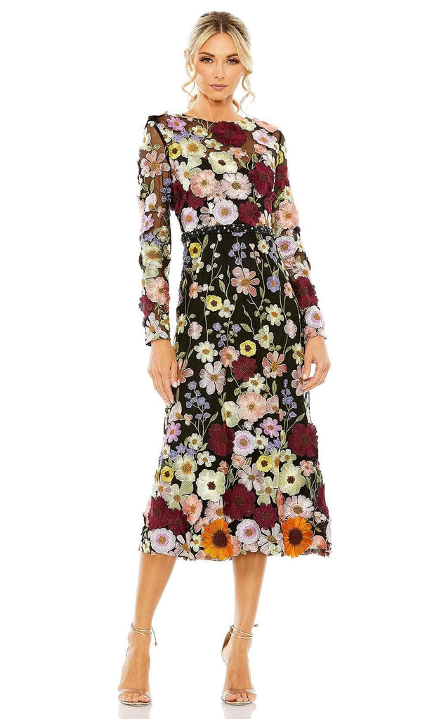 Lavish in the exquisite style and timeless appeal of this Mac Duggal 68462 masterpiece. Beautiful hand-stitched floral applique and embroidery ornamented throughout the dress is absolutely enchanting. The top has an illusion jewel neckline, sheer long sleeves and a beaded thin band that wraps around the waist. The skirt is moulded in a sheath silhouette and skims to the tea-length hemline. Turn heads instantly when you wear this Mac Duggal 68462 dress. Model is wearing the Black Multi color.