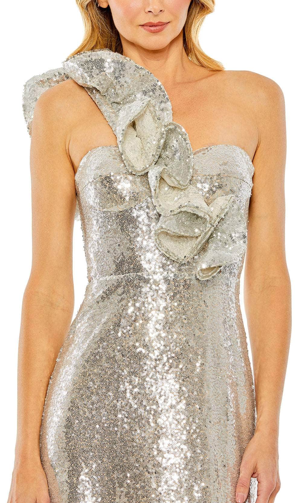 Embrace your inner star on the red carpet in this Mac Duggal 68513 masterpiece. This sleeveless one-shoulder dress is embellished with all-over sequins that sparkle and shine from every angle. The single ruffled strap adds a touch of drama, and provides support to the asymmetrical sweetheart neckline. The mid-open detailing at the back reveals a sight of skin and has a zipper closure for a stylish fit. The sheath skirt highlights your curves and creates a graceful movement as it flows to the full length hemline. Attract attention in this beautiful design from Mac Duggal 68513. Models are wearing Black, and Nude Silver colors.