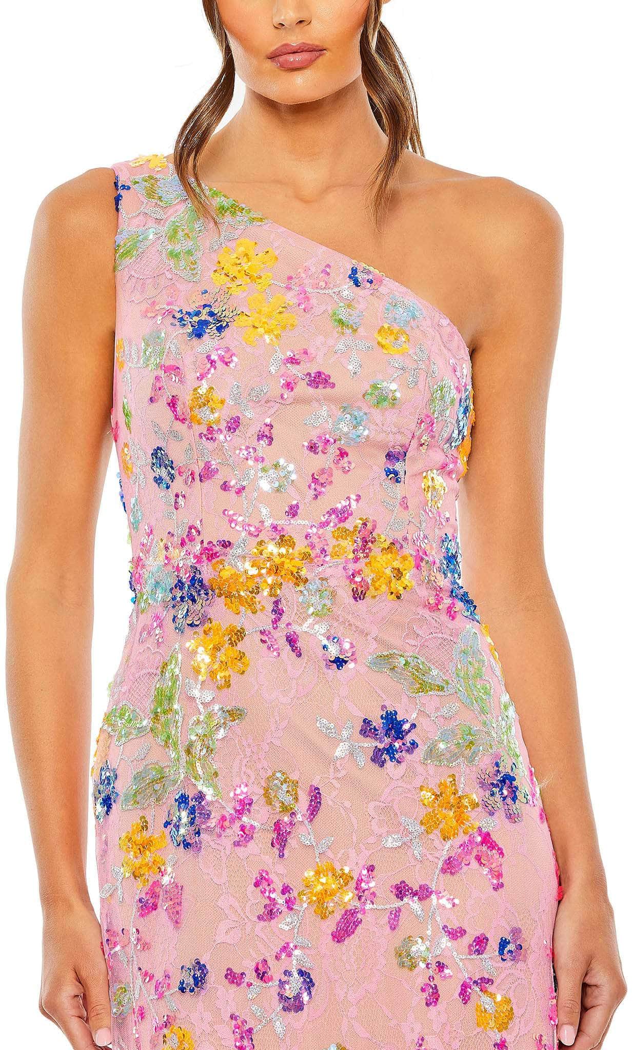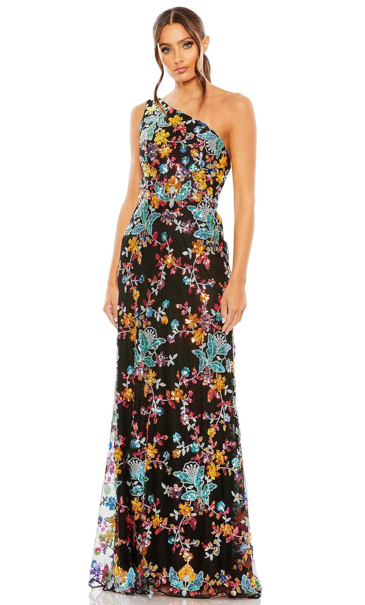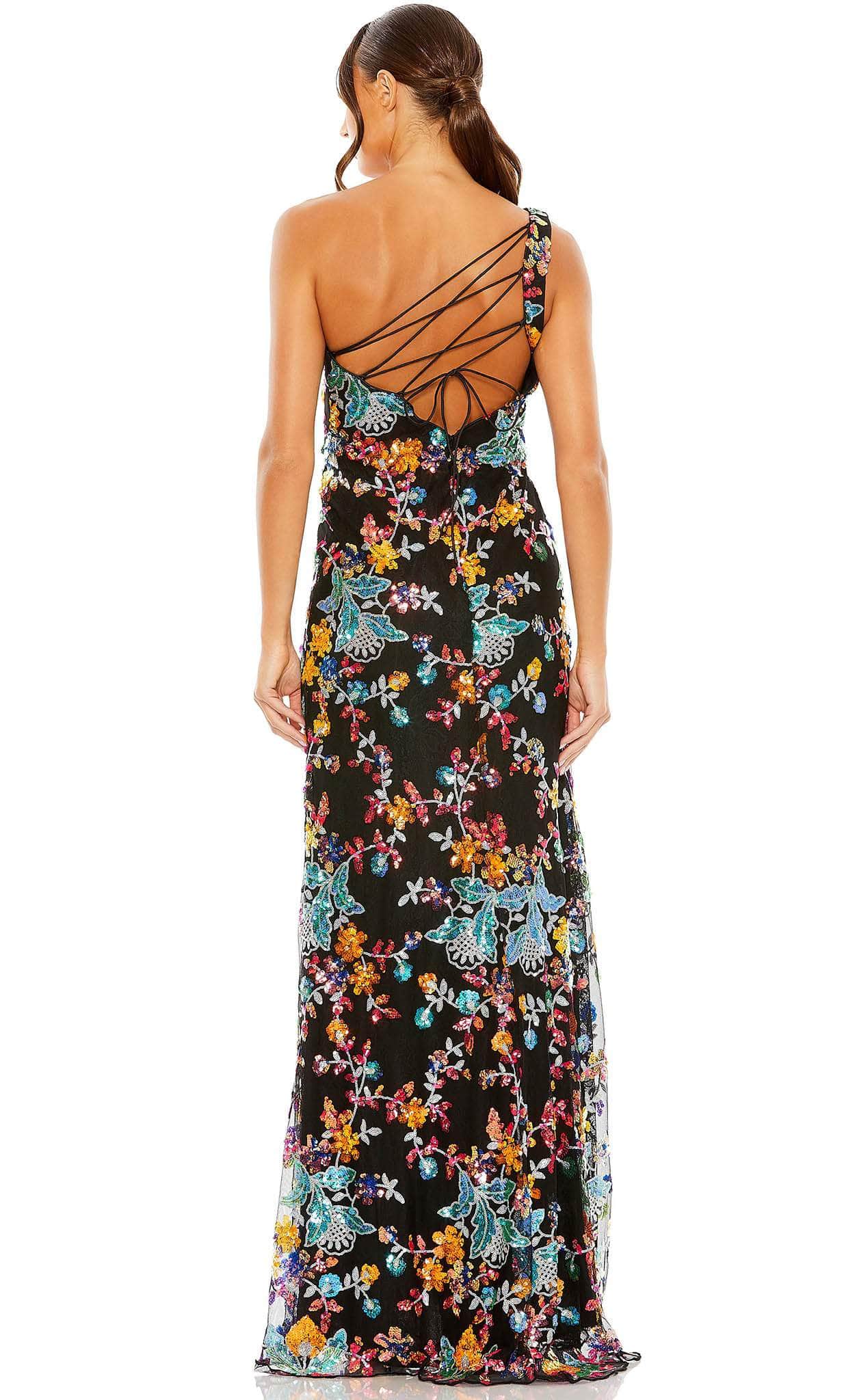 Step out in style wearing this stunning Mac Duggal 68515 creation. Featuring an asymmetrical neckline held by a single wide strap, this sleeveless style is sure to have you turning heads with its floral sequin embellishment and all-over lace fabric. The back is cut in mid-open detail secure by a zipper closure and an adjustable lace-up tie. It parades in a full length sheath silhouette and ends with a slight sweep train. Get ready to shine in this fabulous Mac Duggal 68515 evening gown. Models are wearing the Pink Multi and Black Multi colors.