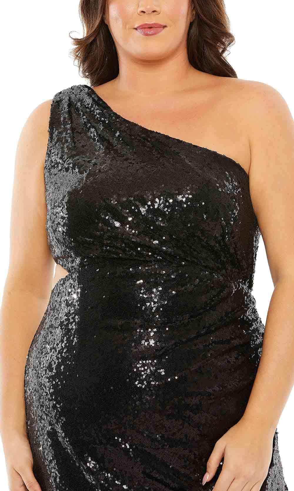Waltz into the party looking fabulous in this creation by Mac Duggal 68539. A dazzling fitted dress festooned with luxurious sequins will capture the attention of everyone. The one-shoulder bodice showcases a sultry side cutout, mirrored asymmetrical neckline, and mid-open back. With an empire waist and side leg slit, the skirt is carved in a column silhouette which graces to a full length hemline. Flaunt your figure in this remarkable dress by Mac Duggal 68539. Models are wearing the Black, and Nude Silver colors.