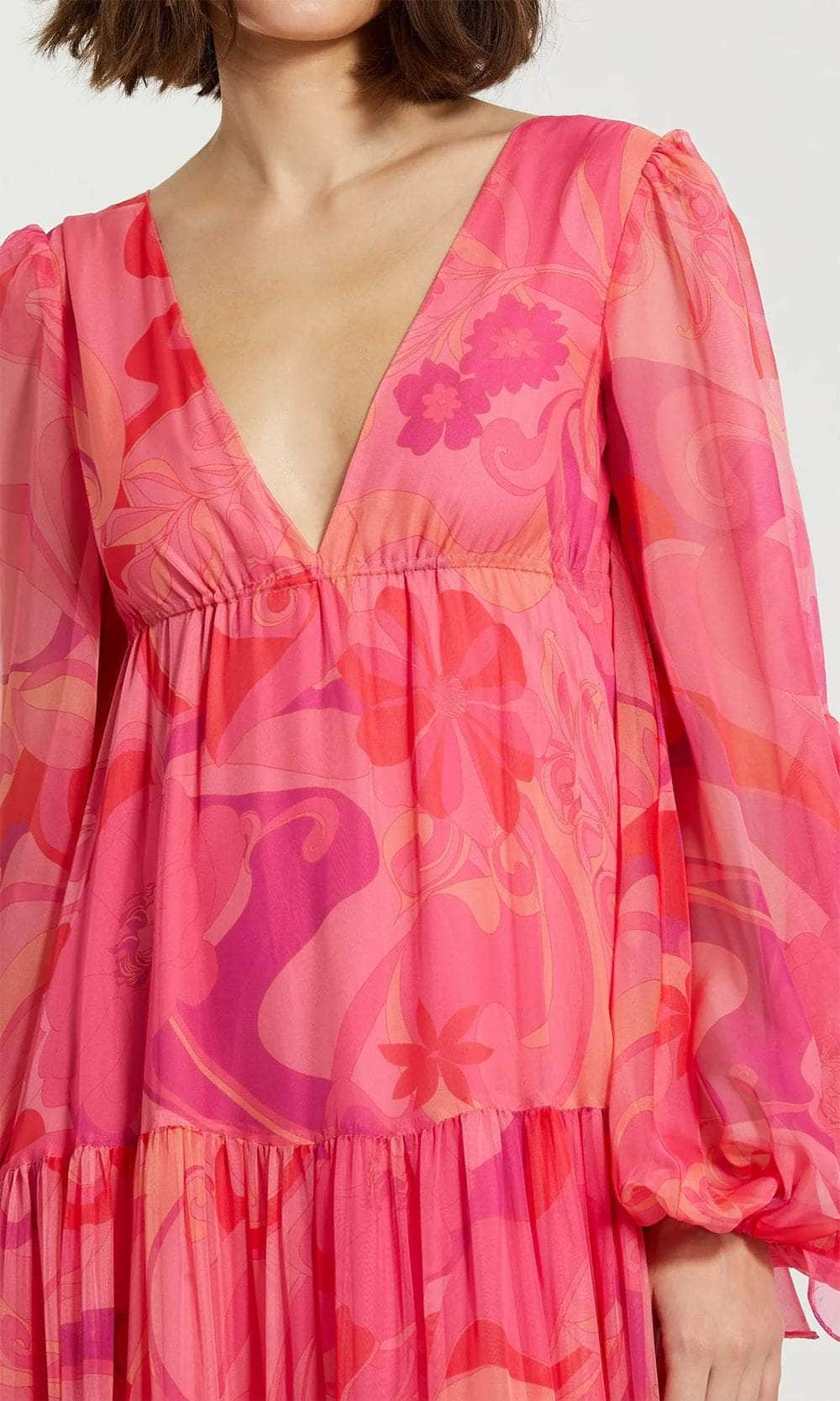 Fascinate the crowd with this Mac Duggal 68782 dress dazzles with fringe detailing throughout, featuring a fitted bodice and a V-neckline. This chiffon dress fashions long sleeves. From the waist features a long A-line skirt, creating a striking and elegant look. Perfect for any special occasion, this Mac Duggal combines modern flair with classic sophistication for a truly captivating appearance. Model is wearing Hibiscus Multi color.