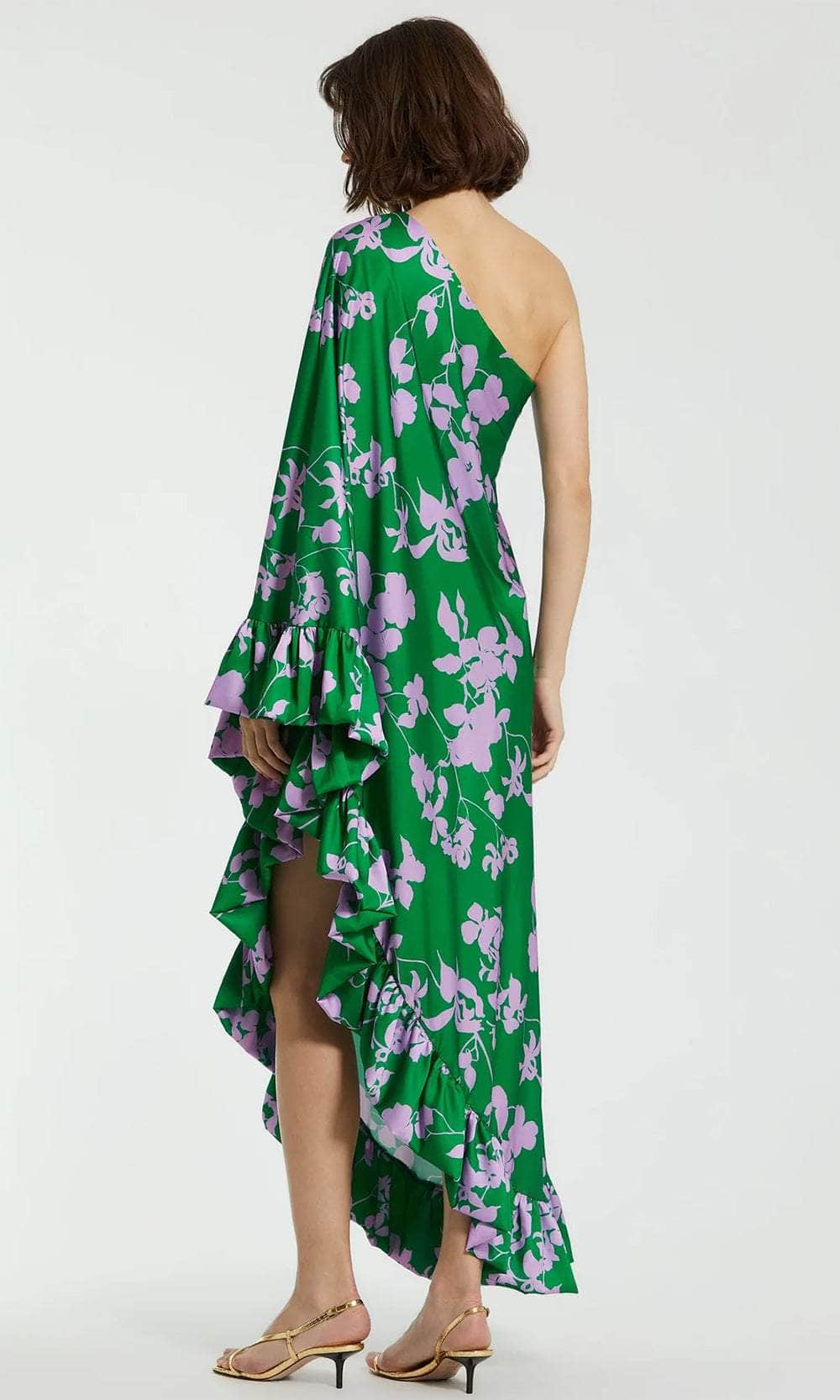 Get ready to be captured in picture of sophistication in this Mac Duggal 68787 dress, tailored from printed charmeuse fabric, showcases striking one-shoulder long bell sleeves and an alluring asymmetrical neckline. Highlighting the design is a cascading draped detail that adds elegance. The full-length skirt flows gracefully in an A-line silhouette, combining sophistication with modern flair. Perfect for formal occasions, this Mac Duggal 68787 exudes charm and ensures a standout presence with its unique silhouette and luxurious fabric, making it a captivating choice for any special event. Model is wearing Green Multi color.