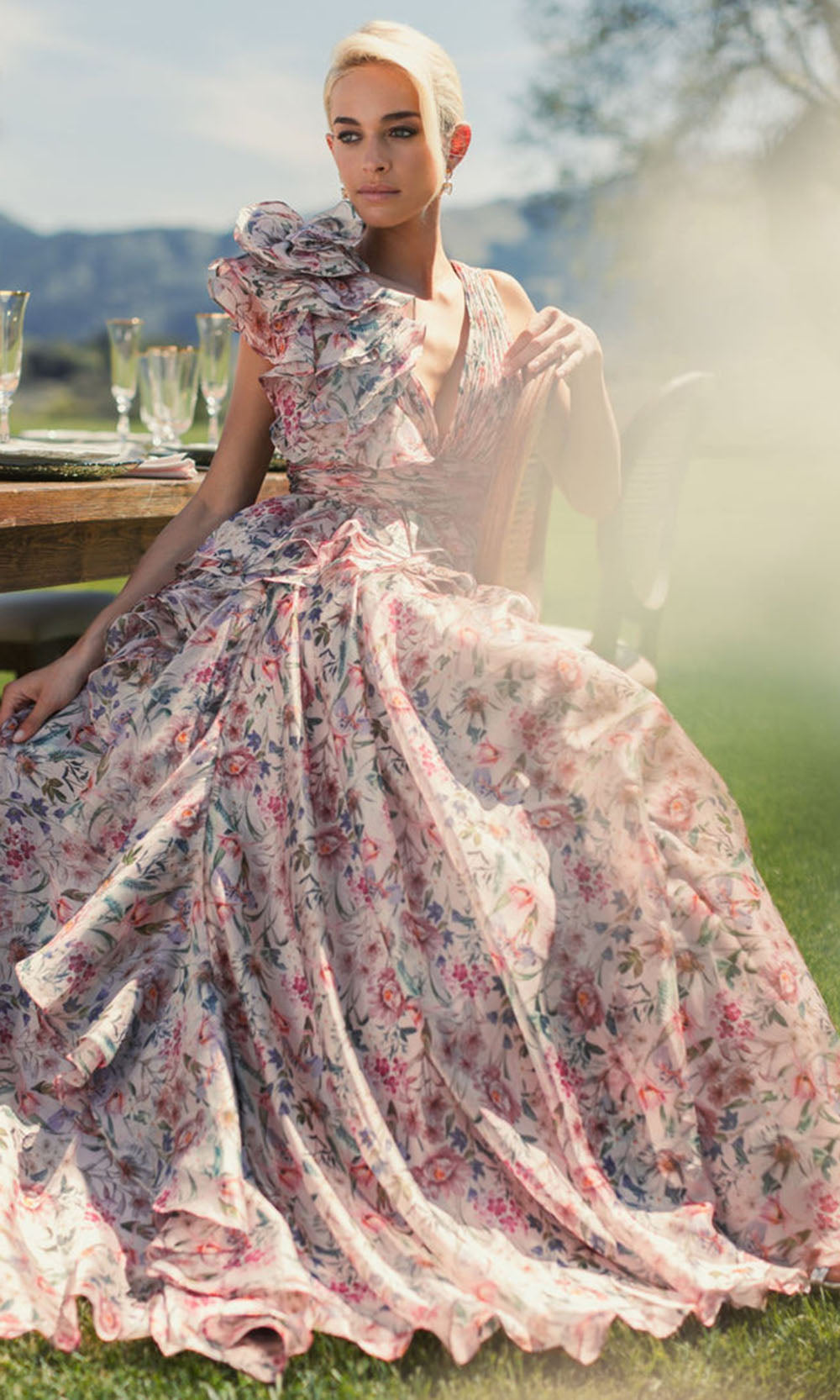 | Details: | Ruffles, Ruched Waistband, Sleeveless, Floral Prints, Cascading Skirt |