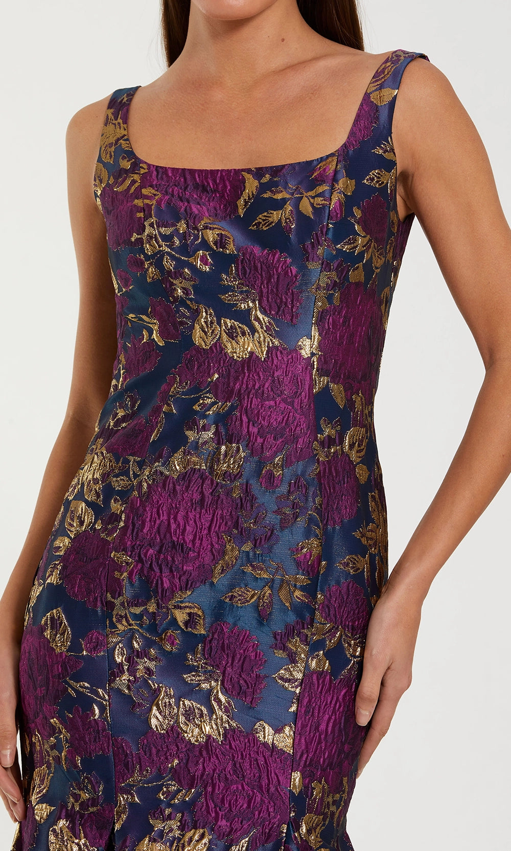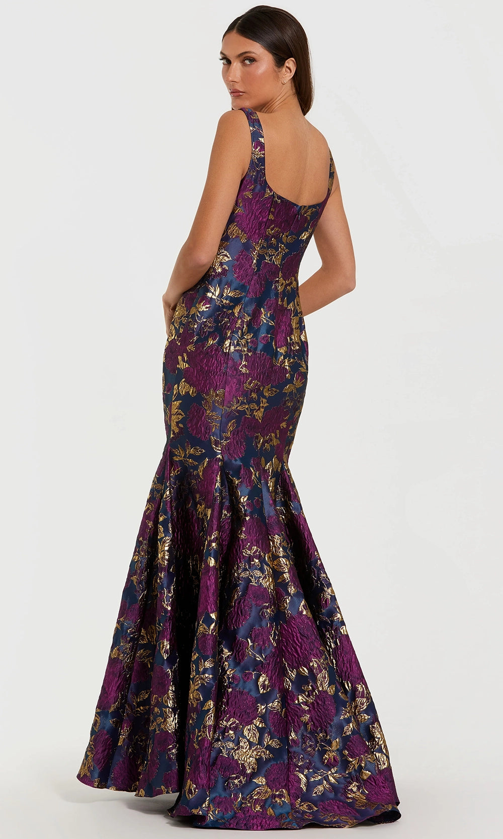 Bold floral brocade and an elegant trumpet silhouette offer a commanding presence in this Mac Duggal 69001 gown. It features a sleeveless square neckline and wide straps that balance its structured bodice. Made in richly textured brocade fabric, this piece contours through the hips and flares at the knees, enhancing movement and grace. The long length and flattering shape are ideal for grand entrances. A back zipper ensures a smooth fit while maintaining its clean shape. Let your evening look shine in the unforgettable Mac Duggal 69001. Model is wearing Midnight Multi color.