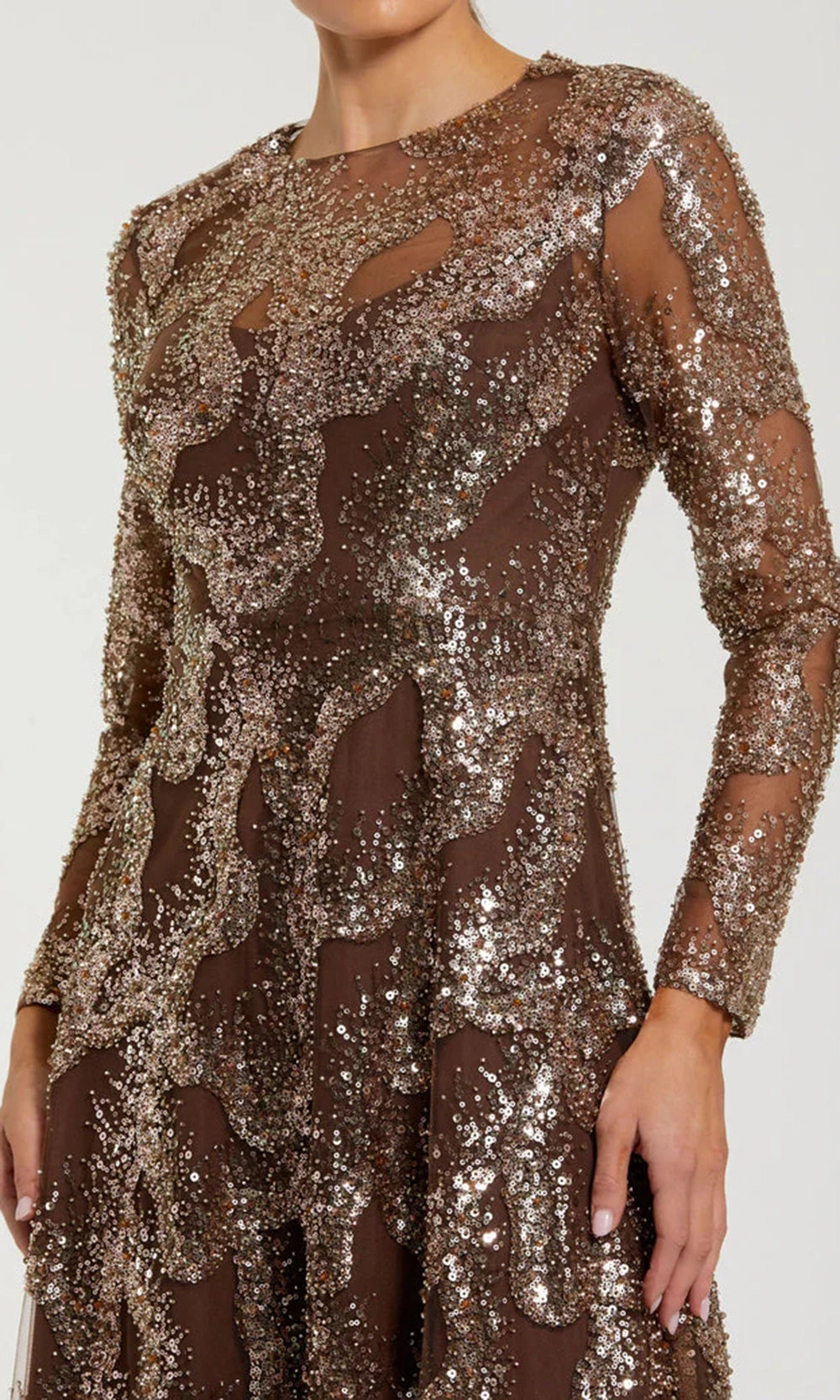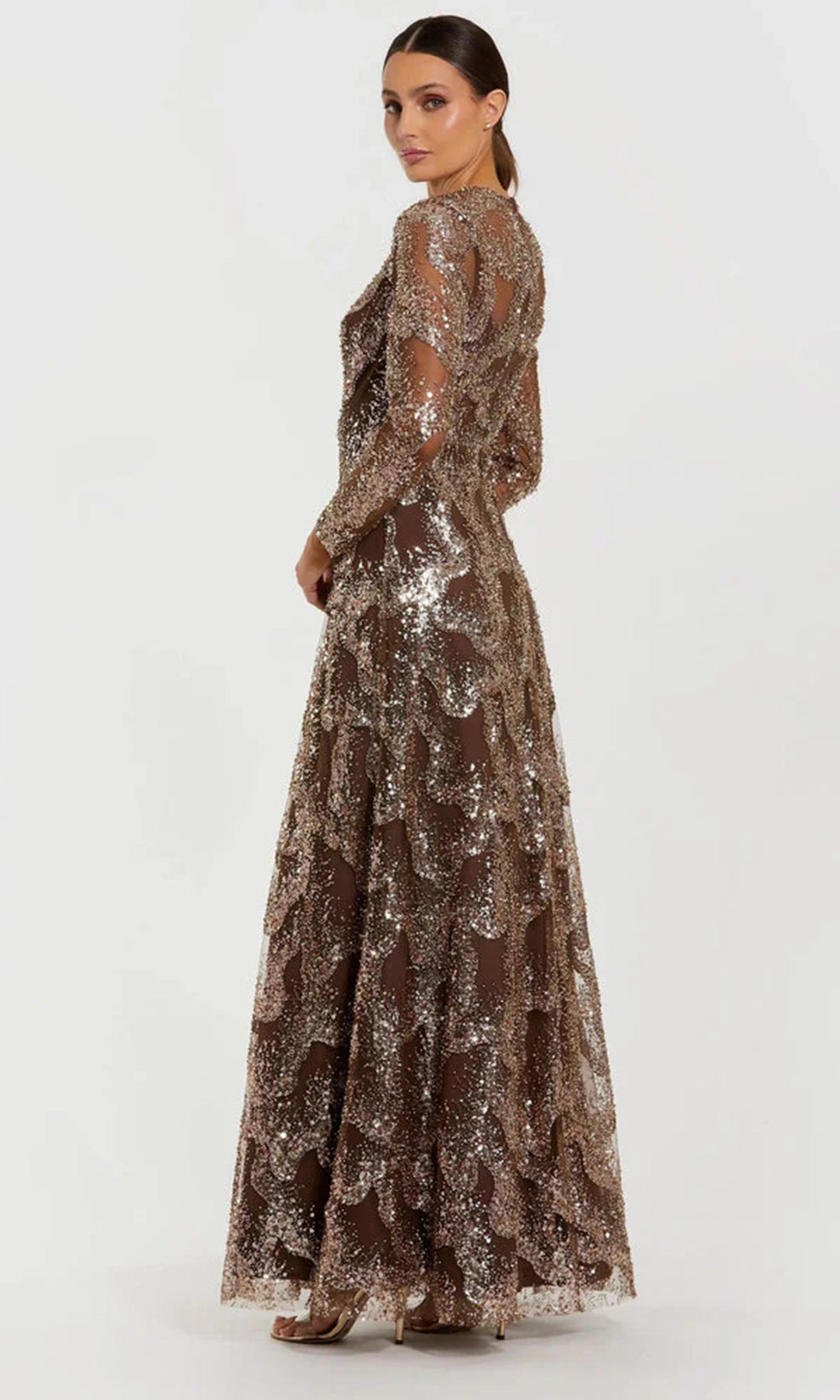 A gown that reflects artistry in motion becomes a piece to treasure, and this Mac Duggal 69005 design exemplifies such craftsmanship. The fitted bodice creates a sleek foundation, while long sleeves bring refinement and balance. An illusion jewel neckline draws subtle attention to the shoulders, complementing the sequined and beaded overlay that shines across the entire gown. The flowing A-line skirt ensures an elegant finish, resulting in a style that feels regal and timeless. The Mac Duggal 69005 is a celebration of design that offers elegance for every meaningful occasion. Model is wearing Bronze color.