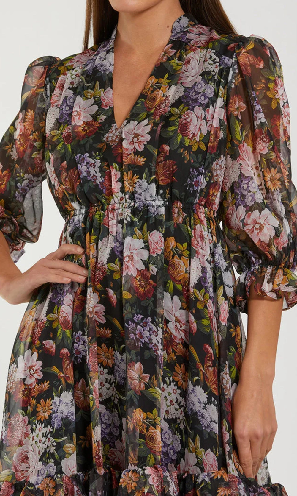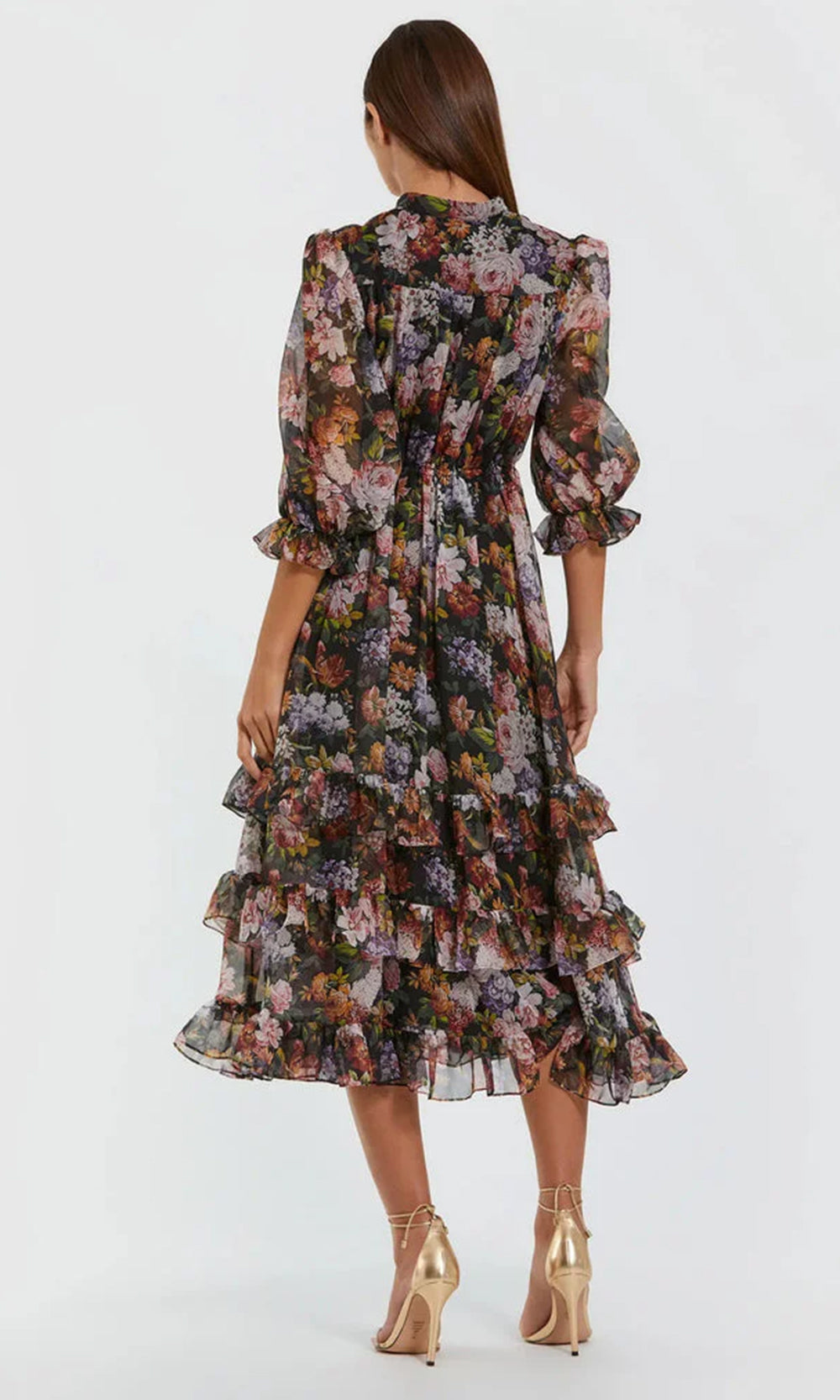 | Details: | Three-Quarter Sleeves, Tiered Ruffle Skirt, Floral Print, Closed Back, Invisible Back Zipper |