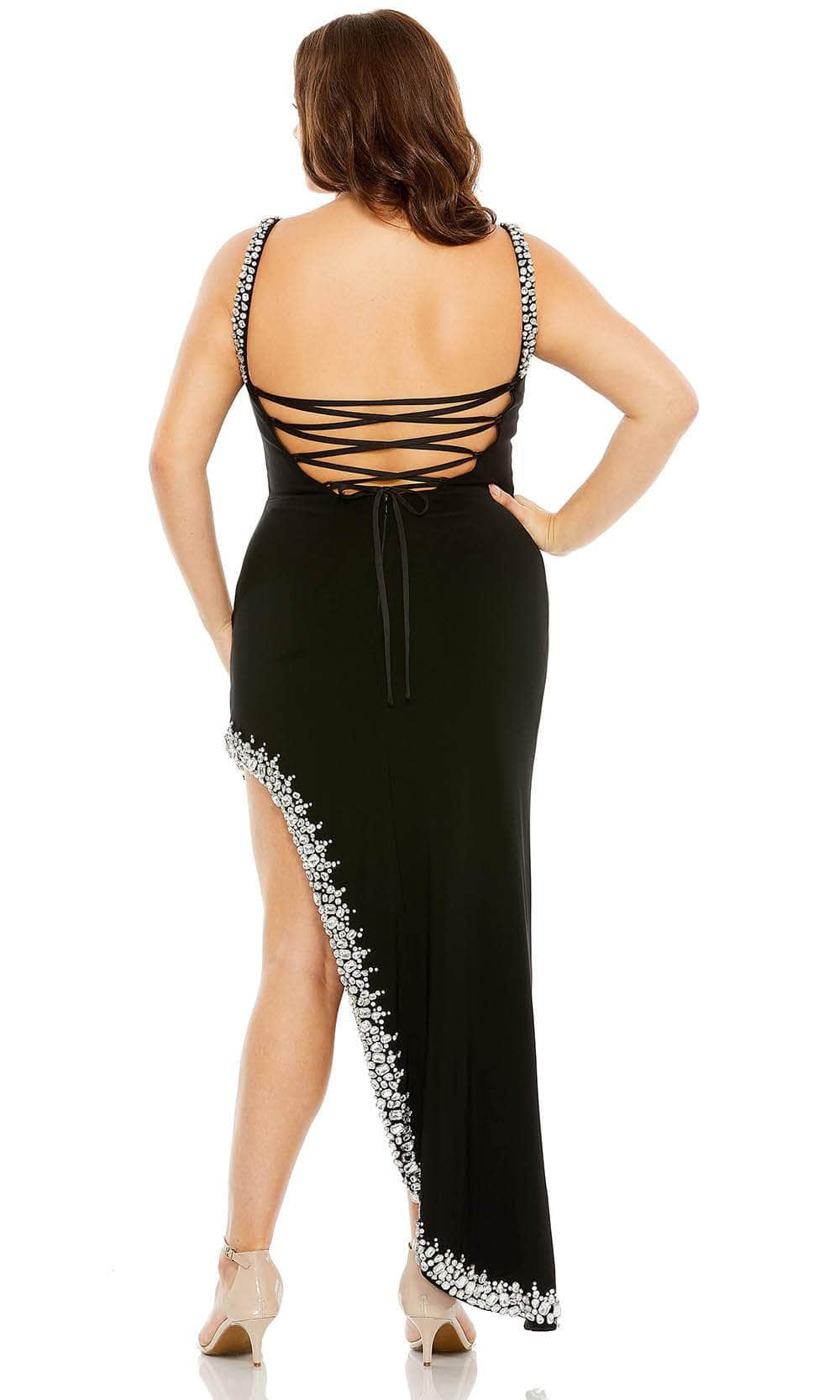Add a touch of sophistication and exclusivity to your wardrobe with this stunning Mac Duggal gown. Crafted from luxurious jersey fabric, this elegant plus-size dress features a square neckline and embellished straps that lend a subtle sparkle to the sleeveless silhouette. A lace up back and asymmetrical finished hem lend a modern touch of style, ensuring you make a statement wherever you go. Make a sophisticated impression in this plus size evening gown by Mac Duggal. Model is wearing the Black color.