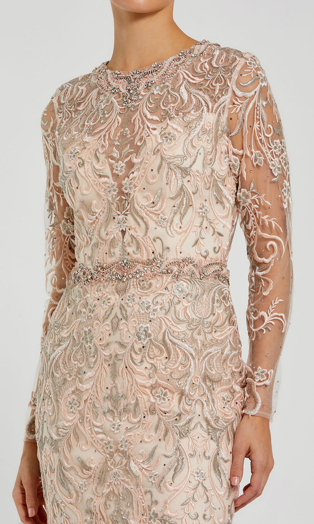 Intricate artistry and haute couture detailing define the breathtaking Mac Duggal 79267 gown. This floor-length masterpiece features a sheer jewel neckline and long sleeves, each adorned with floral embroidery and beadings. The mermaid silhouette flatters the frame while the feather-trimmed hem adds movement and high-fashion texture. A beaded waistband softly accentuates the natural waist, enhancing the elegance of the overall design. Crafted for moments that demand elevated sophistication, Mac Duggal 79267 style delivers drama, elegance, and timeless refinement in equal measure. Model is wearing Blush color.