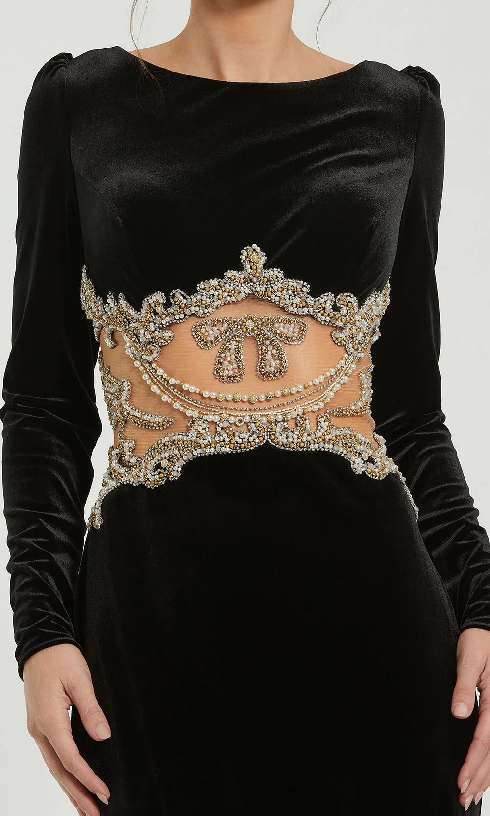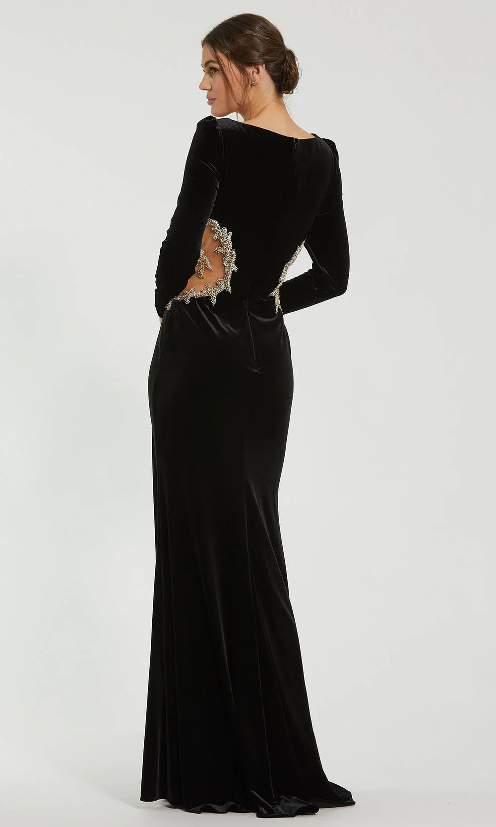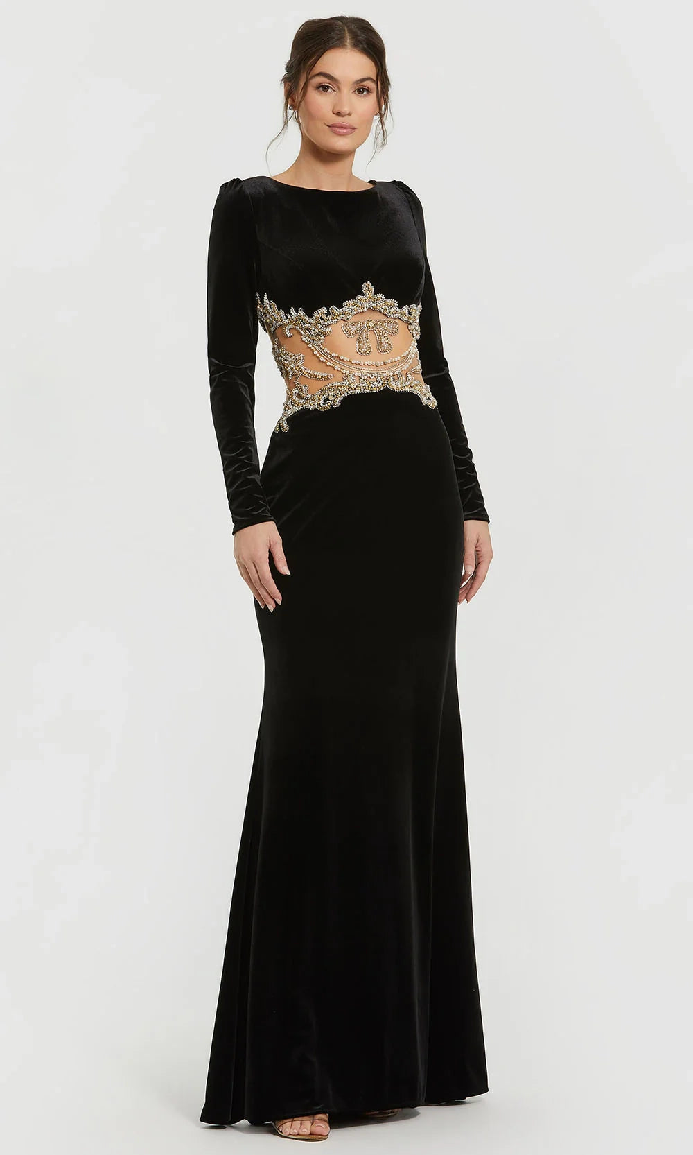 Sophisticated drama comes to life in this Mac Duggal 79445 velvet masterpiece, where sculptural lines meet ornate detail. An illusion cutout and shimmering beaded appliques at the waist serves as the focal point, adding unexpected contrast to the clean silhouette. Long sleeves and a bateau neckline offer refined balance, while the fitted sheath skirt enhances poise and structure. Let Mac Duggal 79445 style be your answer to bold elegance, perfect for evenings that deserve a memorable impression. Model is wearing Black color.
