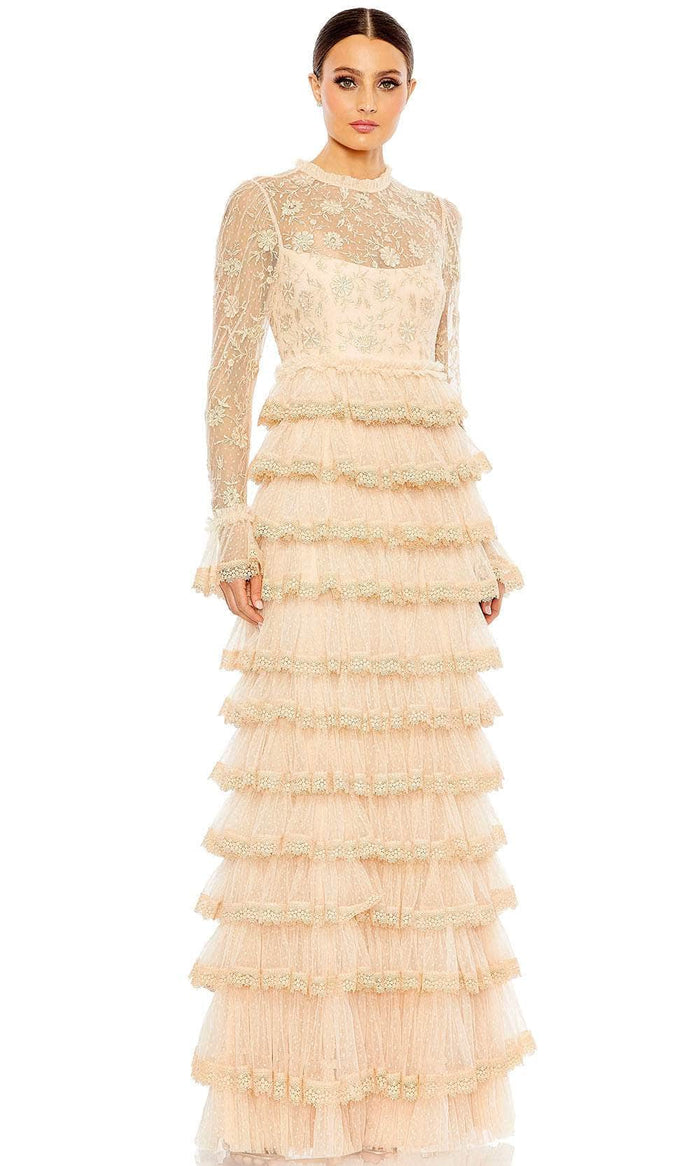 Experience sophistication in the Mac Duggal 8004 dress. Meticulously fashioned from delicate embroidered mesh overlay, it showcases sheer long sleeves, a majestic high neckline, and a full-back enhanced by a central zipper. The tiered floor-length skirt gracefully descends with graceful frills, forming a captivating column silhouette. Embrace the allure of the Mac Duggal 8004, where intricate details and an elegant design harmonize effortlessly to create a captivating evening ensemble that exudes enchantment. Model is wearing Ecru color.