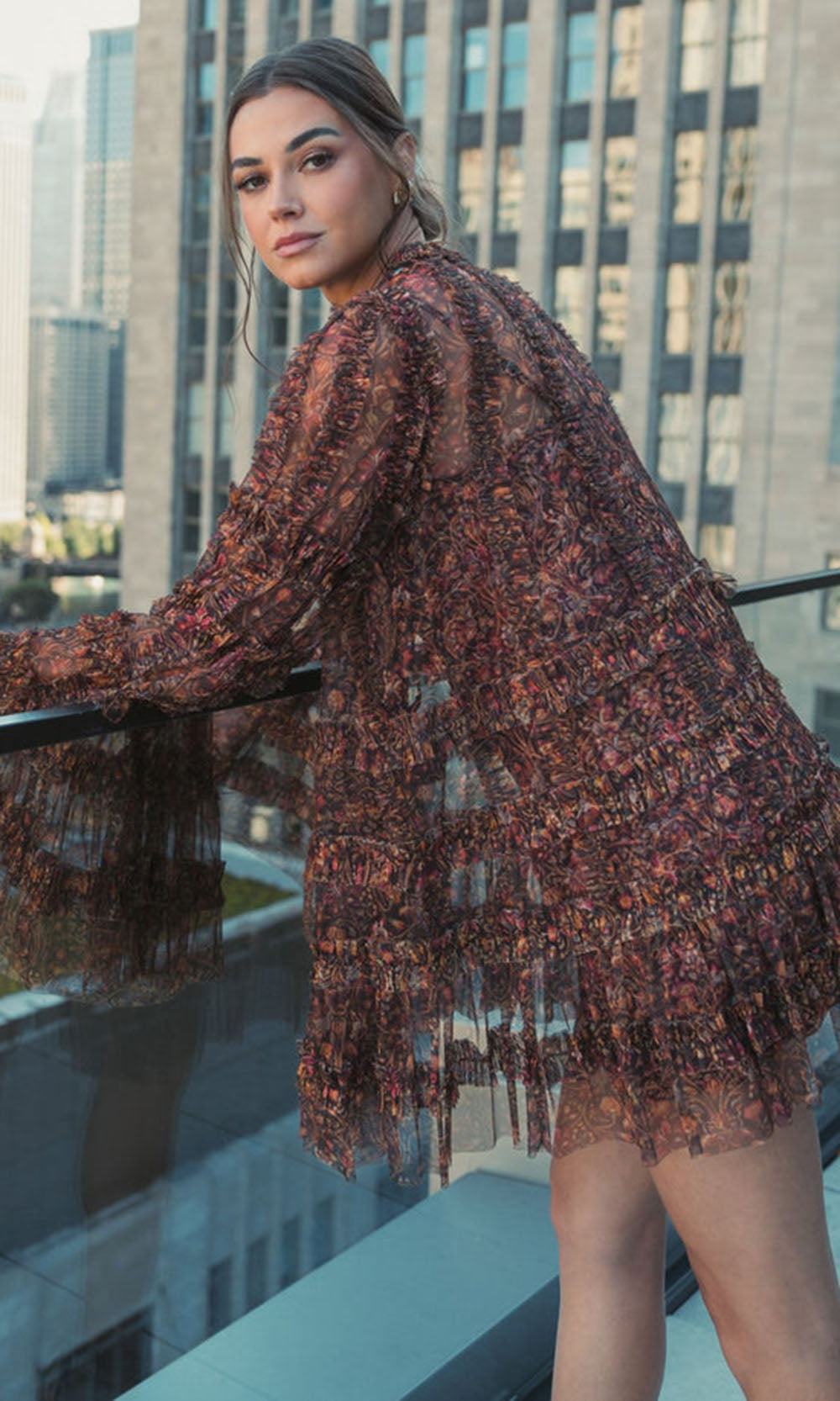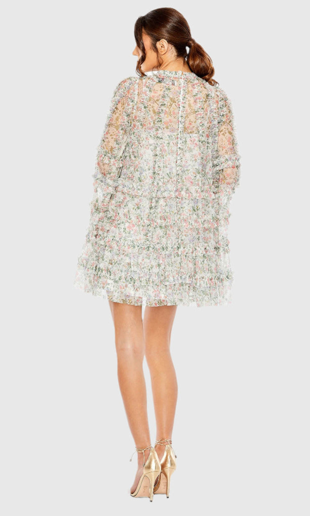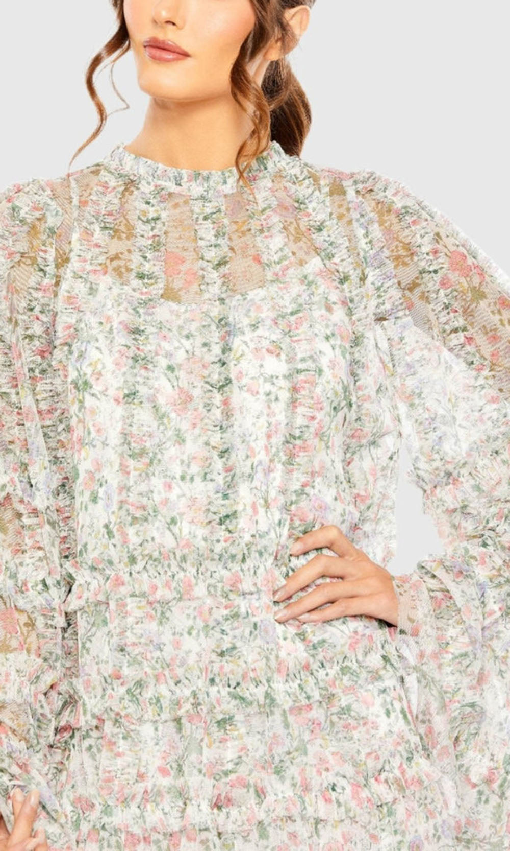 | Details: | Floral Print, Long Cape Sleeves, Ruffle Tiered Bodice, Partial Illusion Back |
