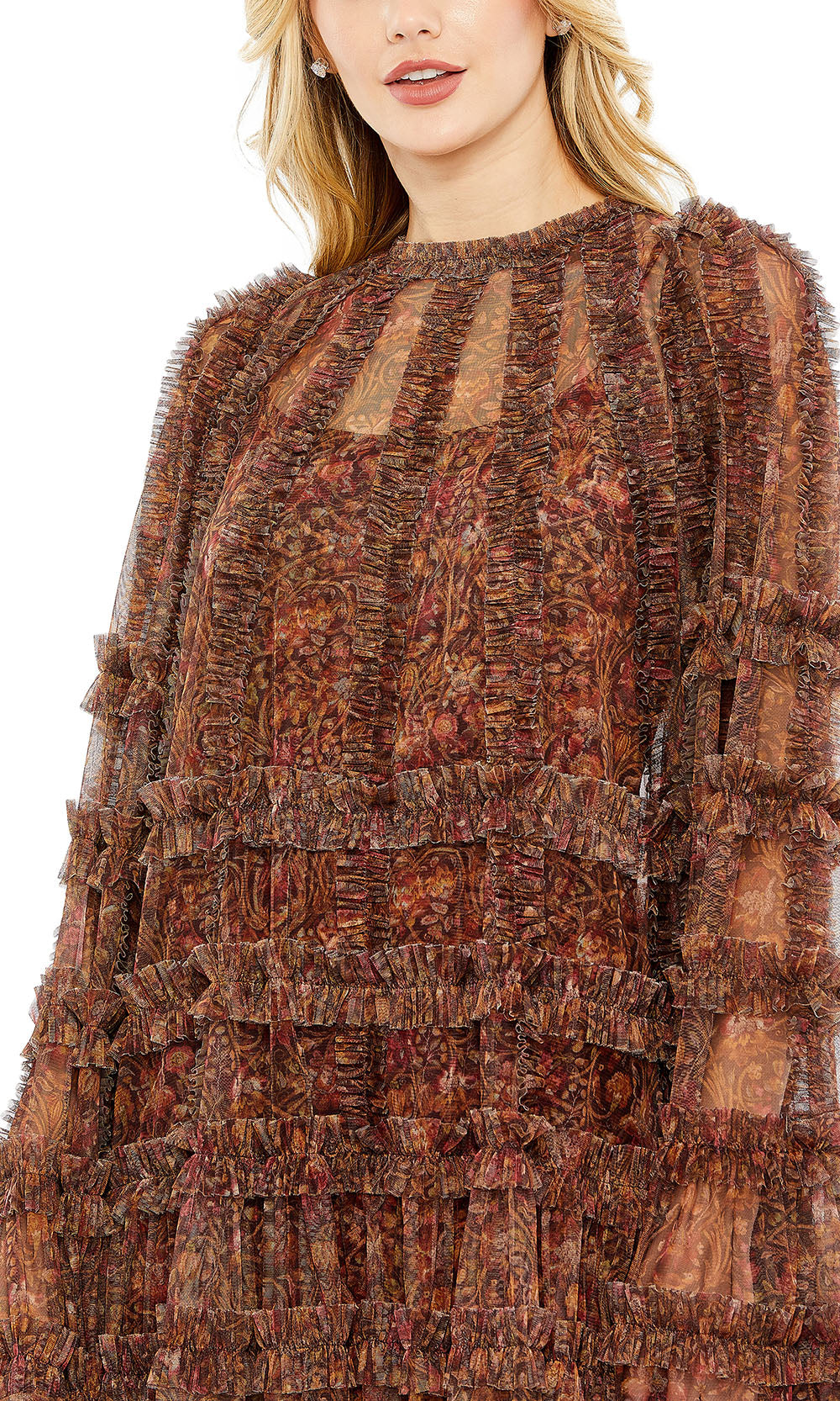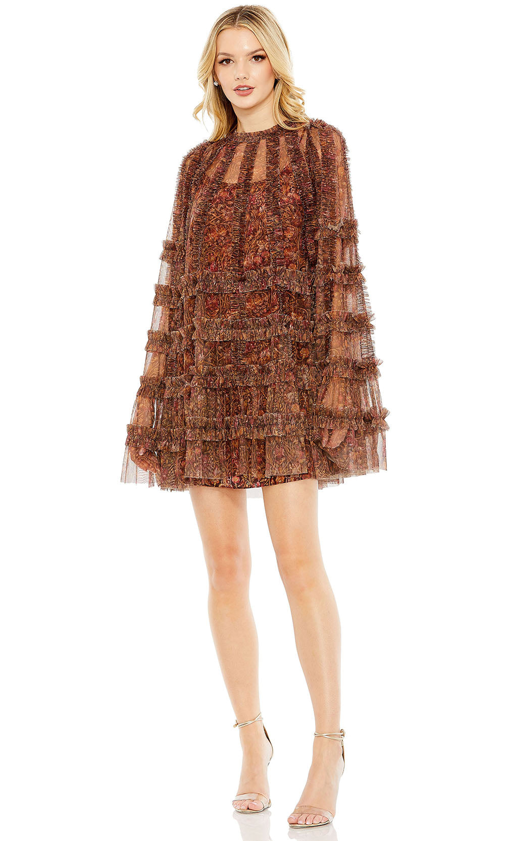 From the layered texture to its whimsical movement, Mac Duggal 8007A style creates an eye-catching silhouette that balances elegance with playfulness. Featuring a jewel neckline and long cape sleeves, the relaxed fit of this A-line dress allows comfort while embracing high fashion. Delicate tiered ruffles cascade over the floral print mesh base, adding volume and graceful texture to the design. This short length makes it a standout for cocktail parties, semi-formal events, or chic night-outs. Let Mac Duggal 8007A add a fresh and memorable twist to your dress collection. Models are wearing Brown Multi and Floral Multi colors.