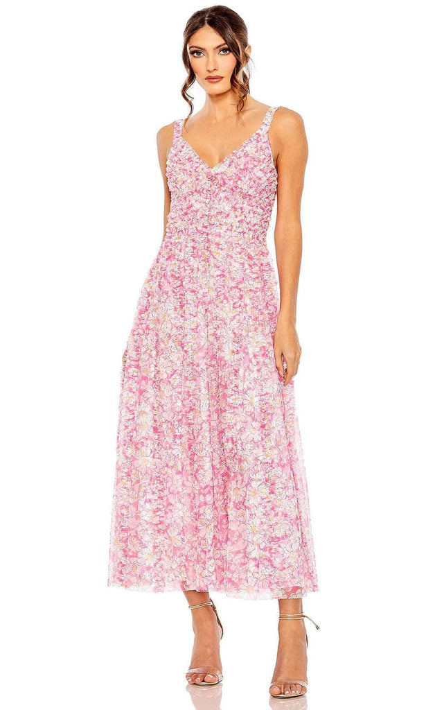 Indulge in a garden of enchantment with the Mac Duggal 8012 dress. Its floral print mesh overlay delicately drapes over a sleeveless fitted bodice, highlighting your curves with grace. The V-neckline adds a touch of allure, while the mid-open back creates a captivating focal point. With a back zipper closure, this dress ensures a seamless fit. The long A-line skirt flows effortlessly, while the all-over ruffle frill detail adds a whimsical touch. Prepare to embrace your inner flower goddess and make a stunning entrance in this extraordinary Mac Duggal 8012. Models are wearing Pink Multi, Pastel Multi, and White Multi colors.