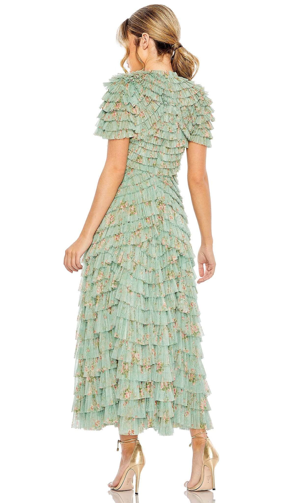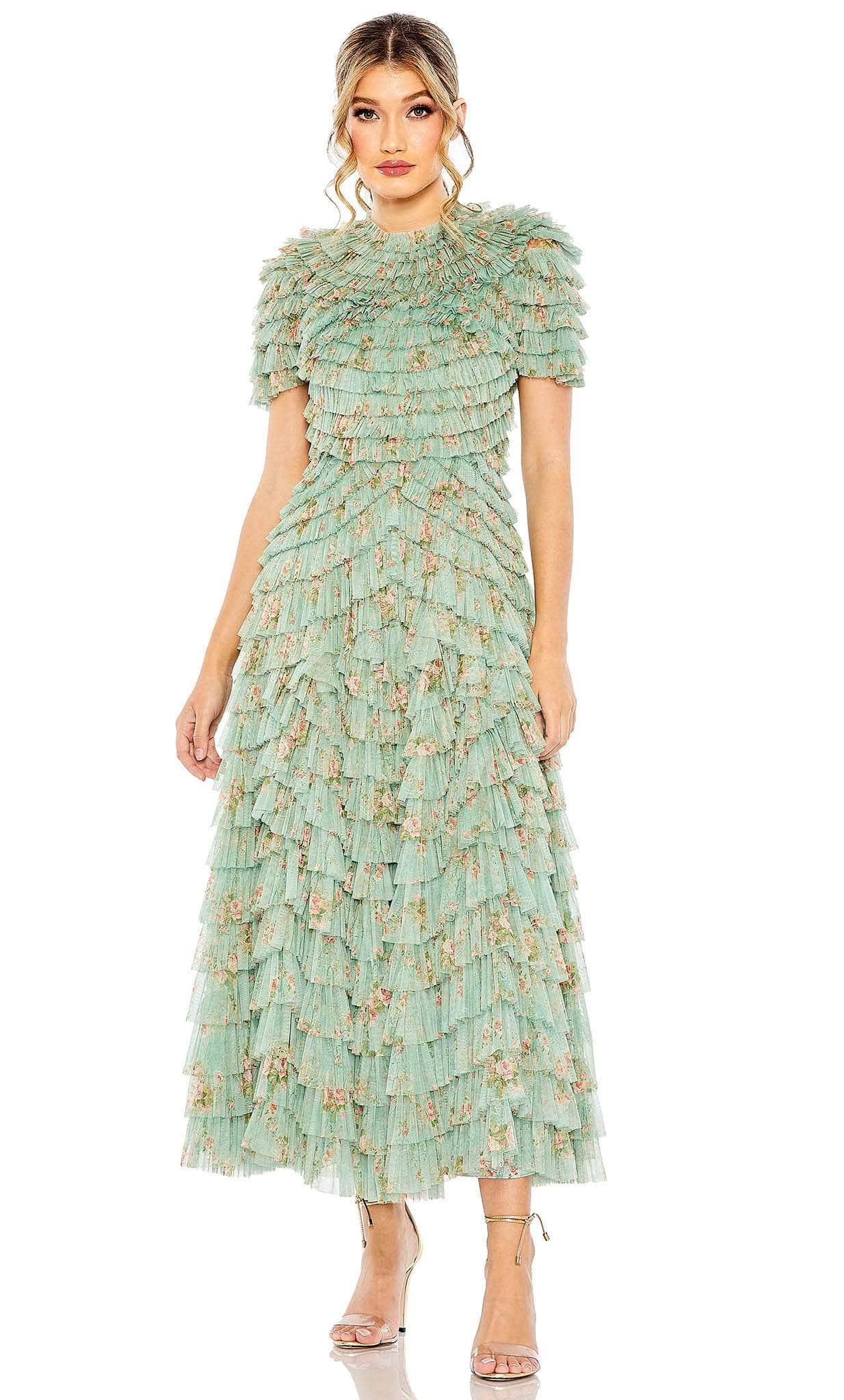 Flaunt your sophisticated and friendly personality as you wear this magnificent masterpiece from Mac Duggal 8014. This winning piece is beautifully designed with ruffle trims all over The bodice is gorgeously crowned with a high neckline and framed with short sleeves. It is perfectly paired with a fully enclosed back. The full-length skirt parades in an A-line silhouette. Wear this Mac Duggal 8014 to look absolutely elegant at your upcoming special event. Model is wearing Sage Multi color.