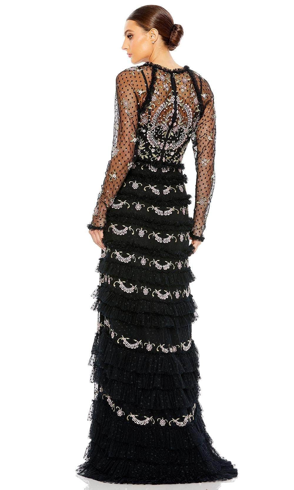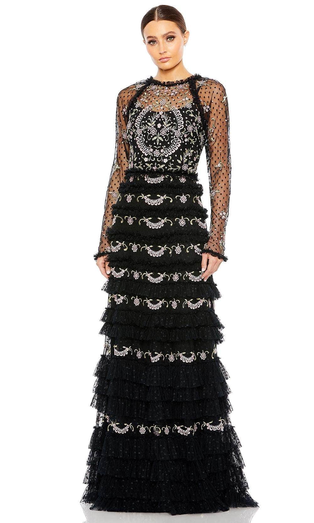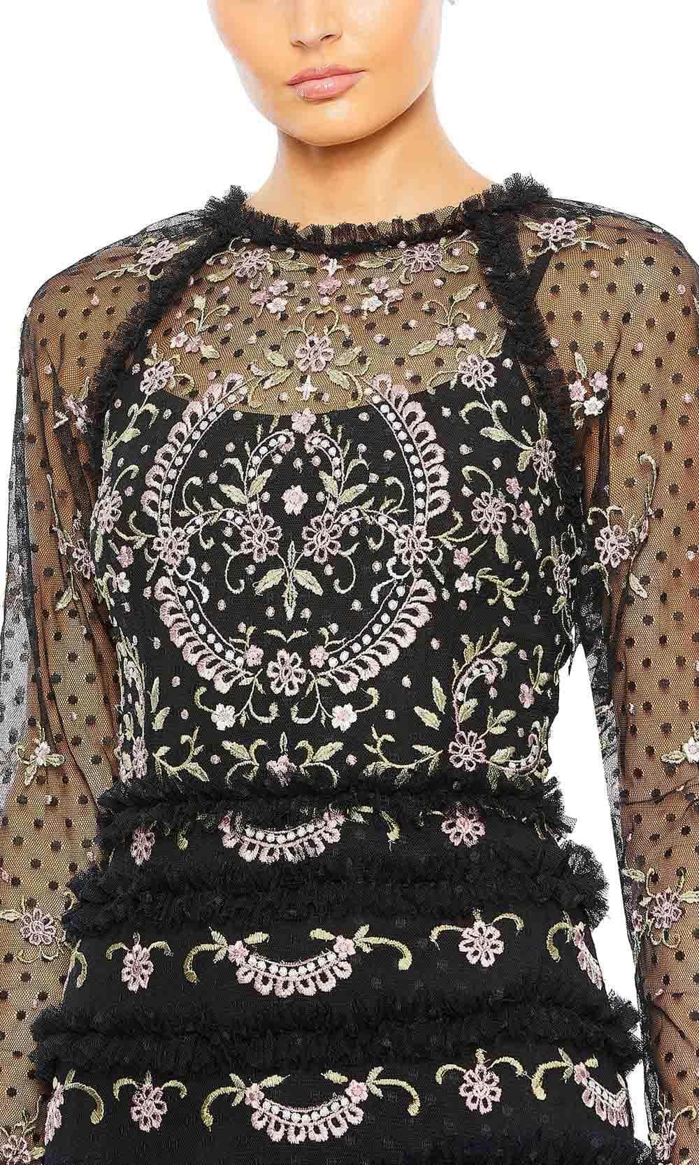 Step into a world of elegance and grace with the Mac Duggal 8030 dress. This enchanting ensemble features sheer long sleeves and a neckline, adding a touch of allure and sophistication. The beaded illusion neckline creates a mesmerizing visual display, while the long embellished sleeves add an extra dose of glamour. The ruffled skirt with floral detailing cascades with every step, adding whimsy and grace. With a back zipper closure, this dress ensures a seamless fit. Prepare to captivate hearts and leave a lasting impression in this extraordinary Mac Duggal 8030. Model is wearing Black Multi color.