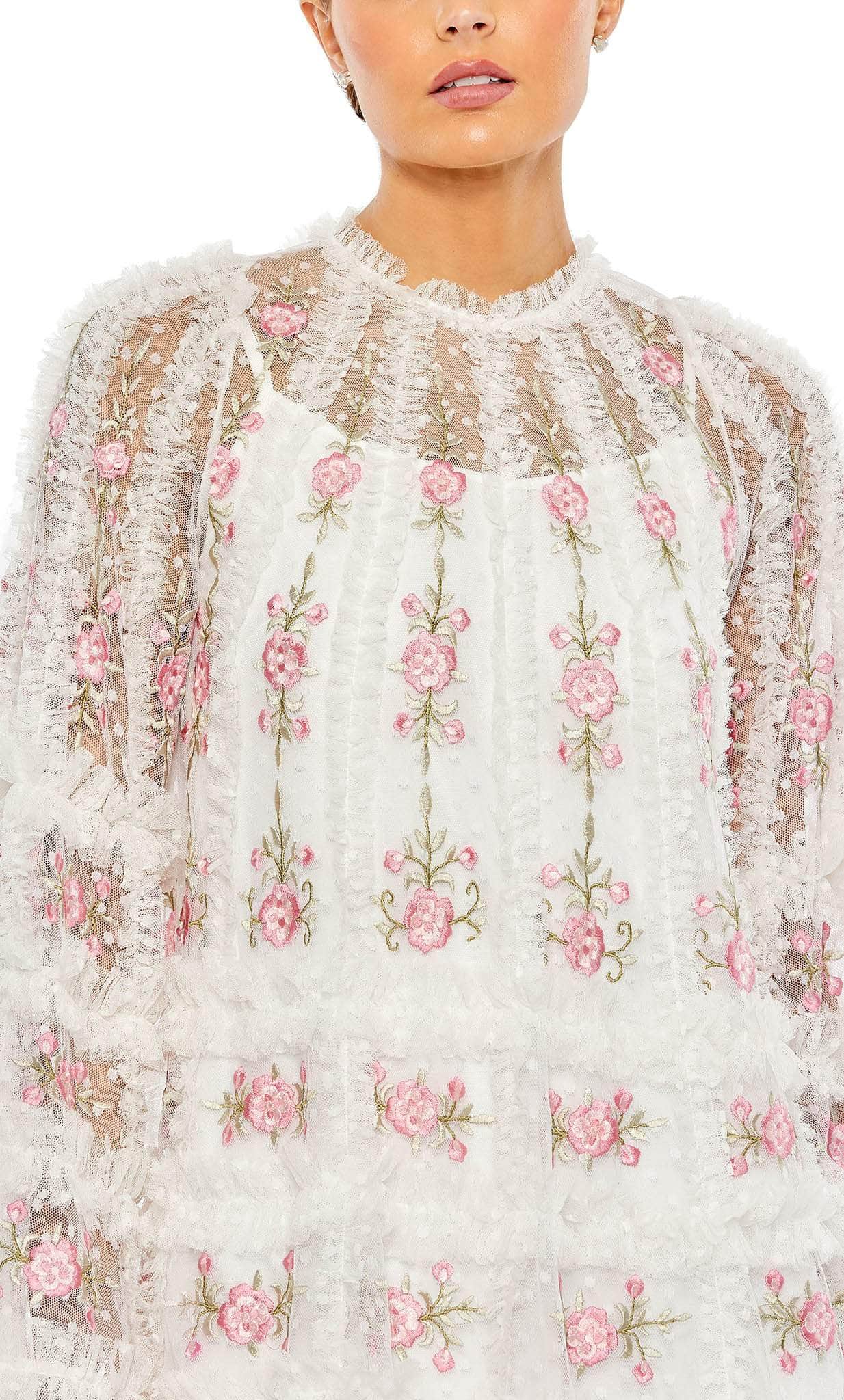 | Details: | Cape Overlay, Sleeveless, Floral Printed, Ruffle Trim |