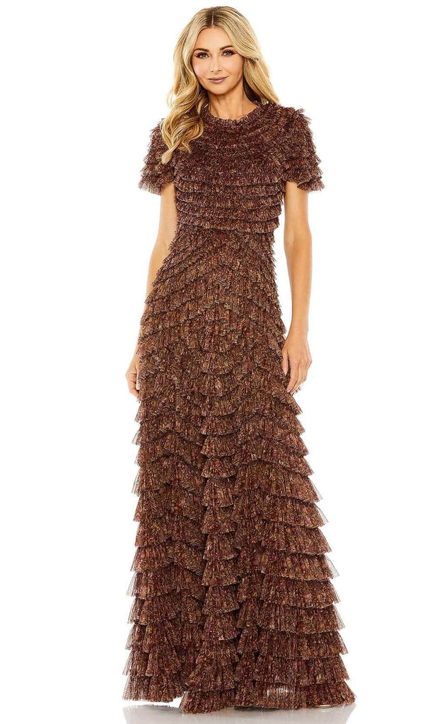 Get primed to climb that social ladder as you captivate the crowd in this charming Mac Duggal 8042 creation. Exquisitely tailored with a fully lined silhouette and festooned with an allover ruffled detailing, this ensemble parades short sleeves framing its high jewel neckline. Exude a whimsical elegance with its intricate textured silhouette, the full back and concealed zipper closure provides a sense of modesty and a seamless design. Donning an eye-catching tiered spectacle on its A-line skirt, this lavish ensemble cascades to form an elegant full-length hemline. Let your fashion choices reflect your stylish flair and impeccable taste with this Mac Duggal 8042 masterpiece. Model is wearing the Brown Multi color.