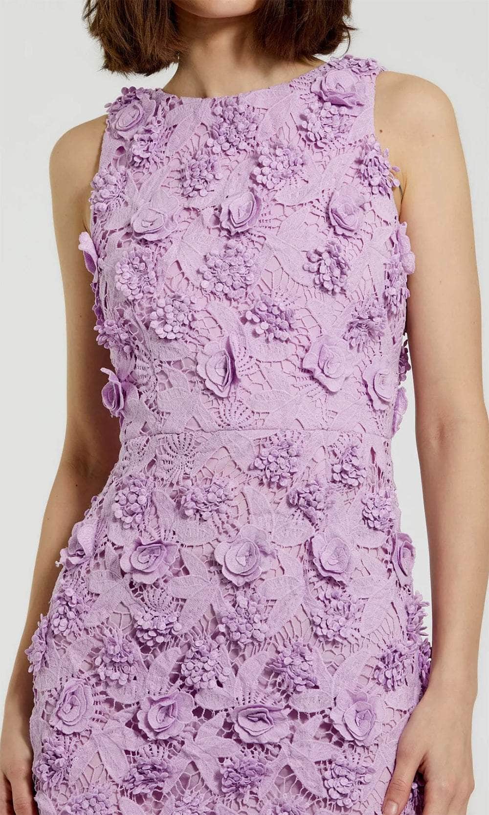 Capture the glamour as you walk on this stunning gorgeous dress by Mac Duggal 81023. Adorned with exquisite 3D floral appliques and delicate embroideries, featuring a sleeveless fitted bodice and a jewel neckline that elegantly complements the full back. Secured with a center zipper for a perfect fit, this dress exudes sophistication. Its short-length skirt flows gracefully in a sheath silhouette, creating a chic and modern look. Perfect for any special occasion, the Mac Duggal 81023 combines intricate detailing with a flattering silhouette for a captivating appearance. Model is wearing Orchid color.