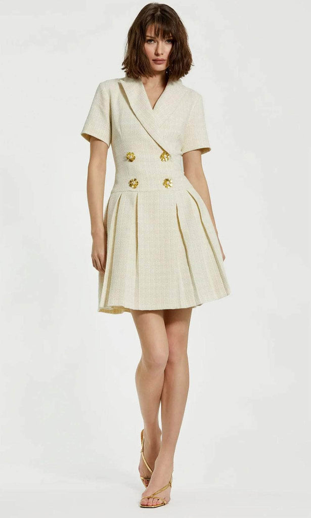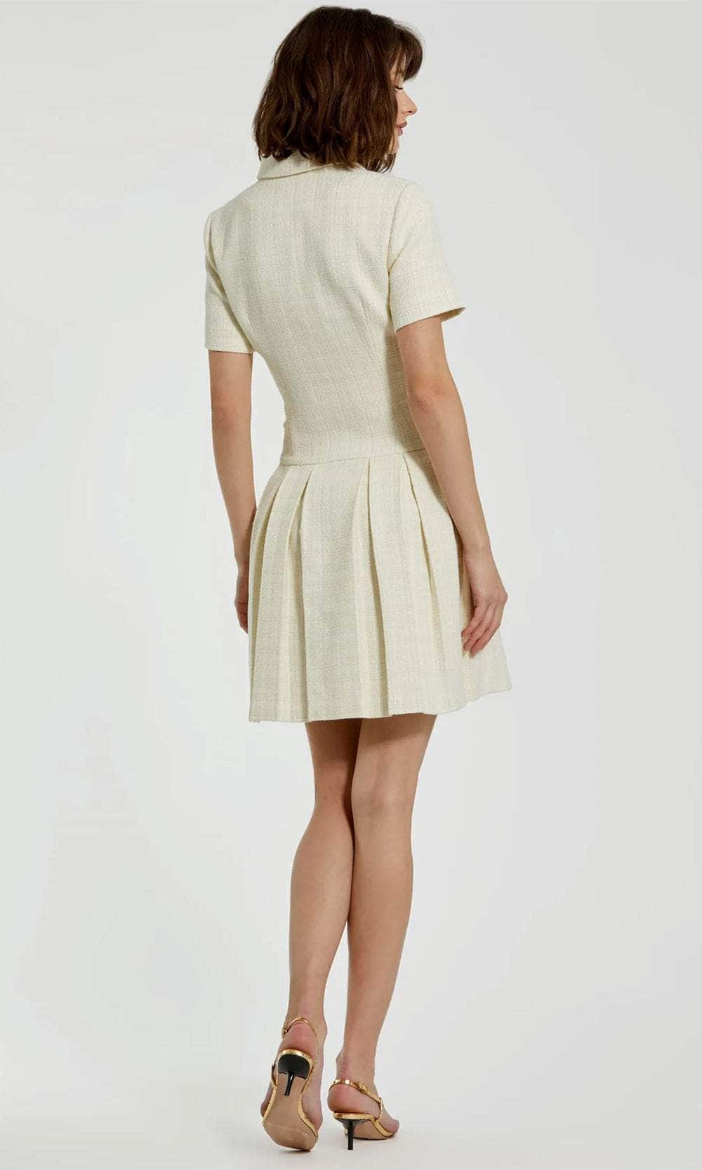 Wrap yourself in glamour with this Mac Duggal 81038 dress is tailored from luxurious tweed fabric, featuring short sleeves and a sophisticated V-neckline with lapel details that extend to the full back. This design creates a cohesive and elegant look. The short-length skirt flows gracefully in an A-line silhouette, offering a flattering and classic style. Perfect for various occasions, this Mac Duggal 81038 combines timeless tweed with modern detailing for a refined and versatile wardrobe piece. Model is wearing Cream color.