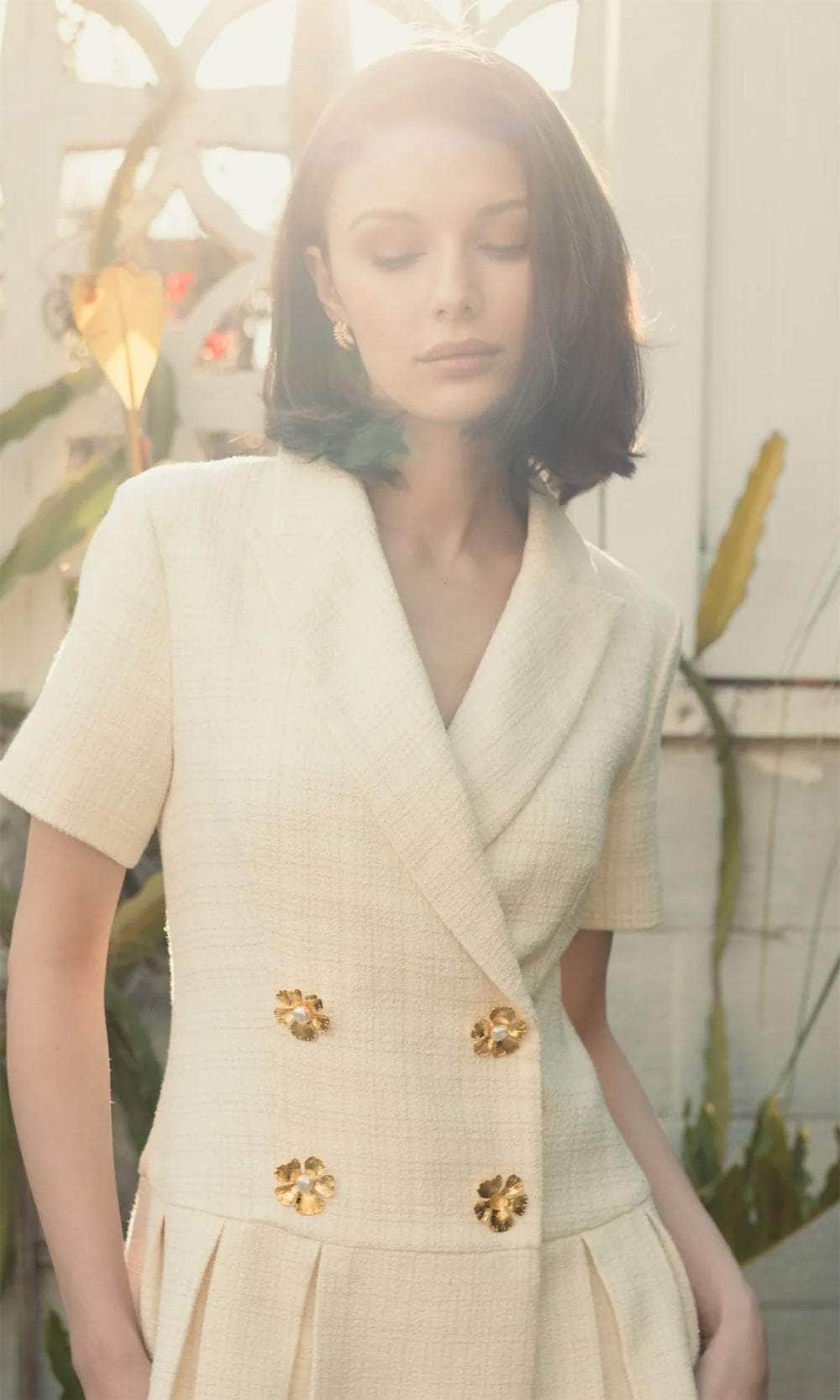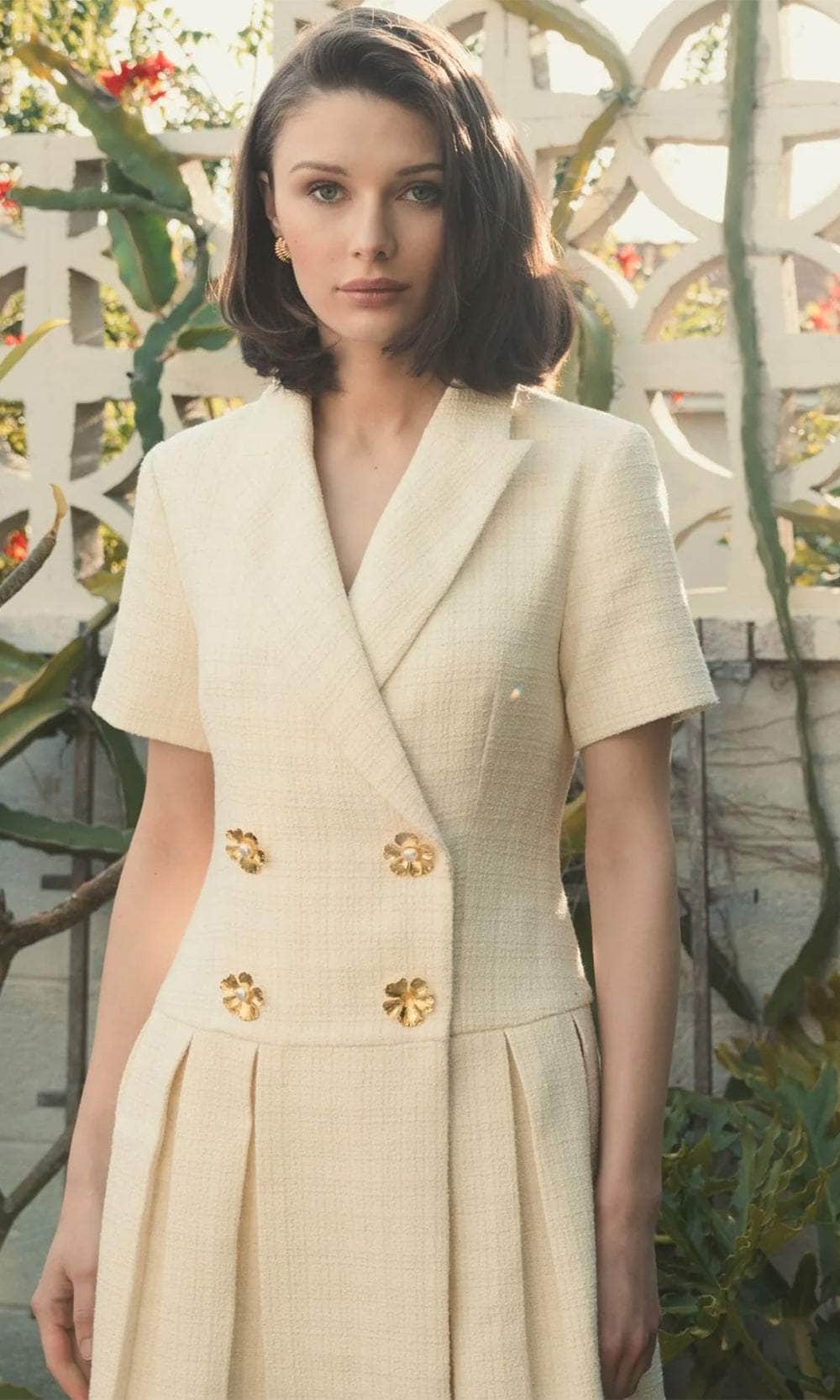 Details: Short Sleeves, Lapel, Floral Buttons, Seams