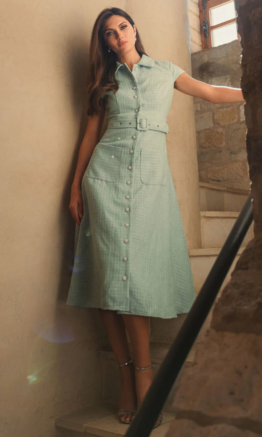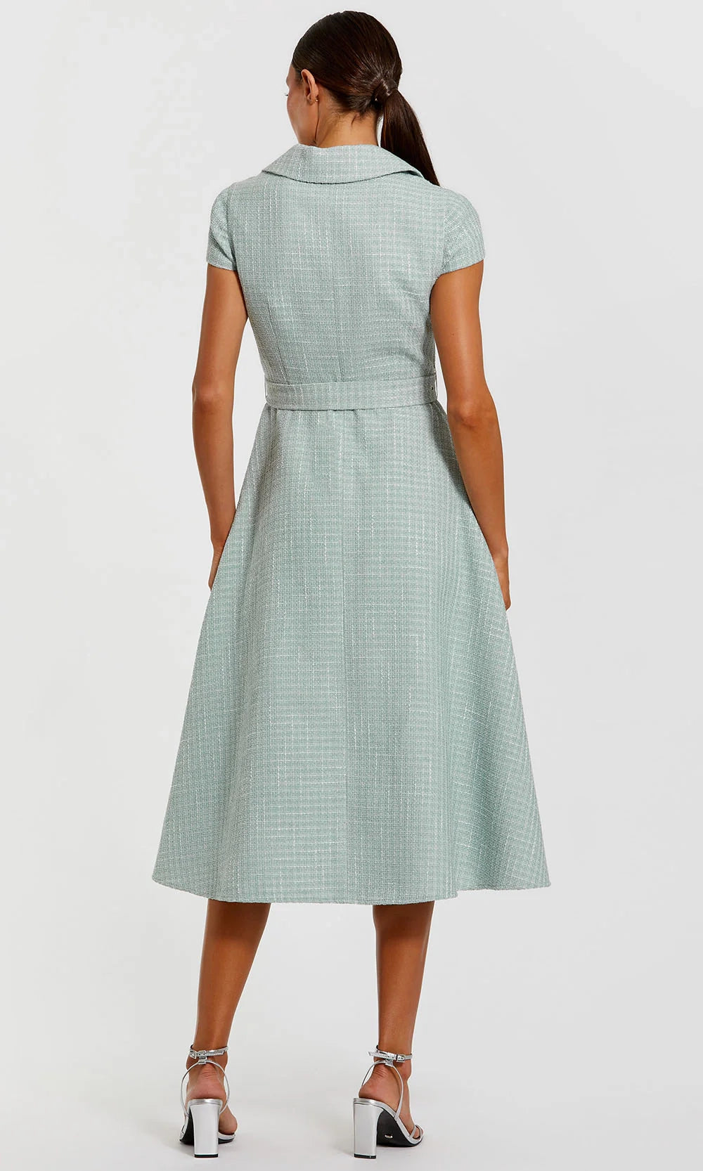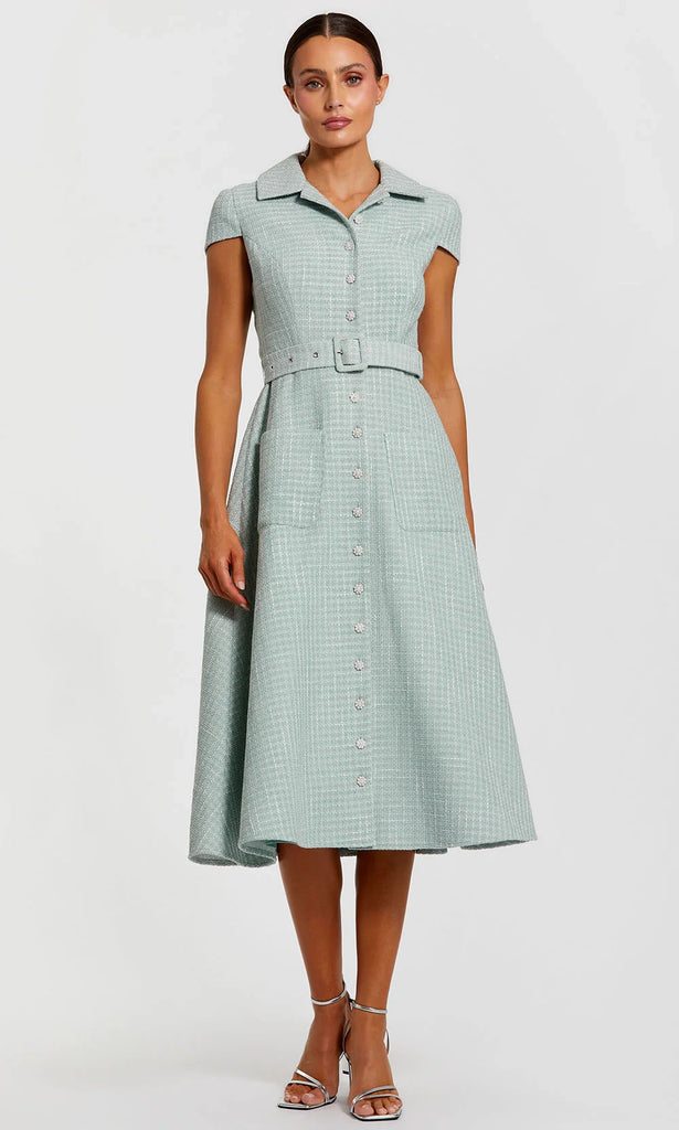 Timeless design meets fresh tailoring in this Mac Duggal 81199 dress made for elegant daytime dressing. The collared v-neckline, belted waist, and pearl-accented front buttons create a refined silhouette, while cap sleeves and front pockets keep it grounded and functional. The tea-length A-line cut offers movement and versatility, ideal for a variety of settings. With charm in every stitch, Mac Duggal 81199 creation is a smart and stylish choice for daytime elegance with a tailored twist. Model is wearing Seafoam color.